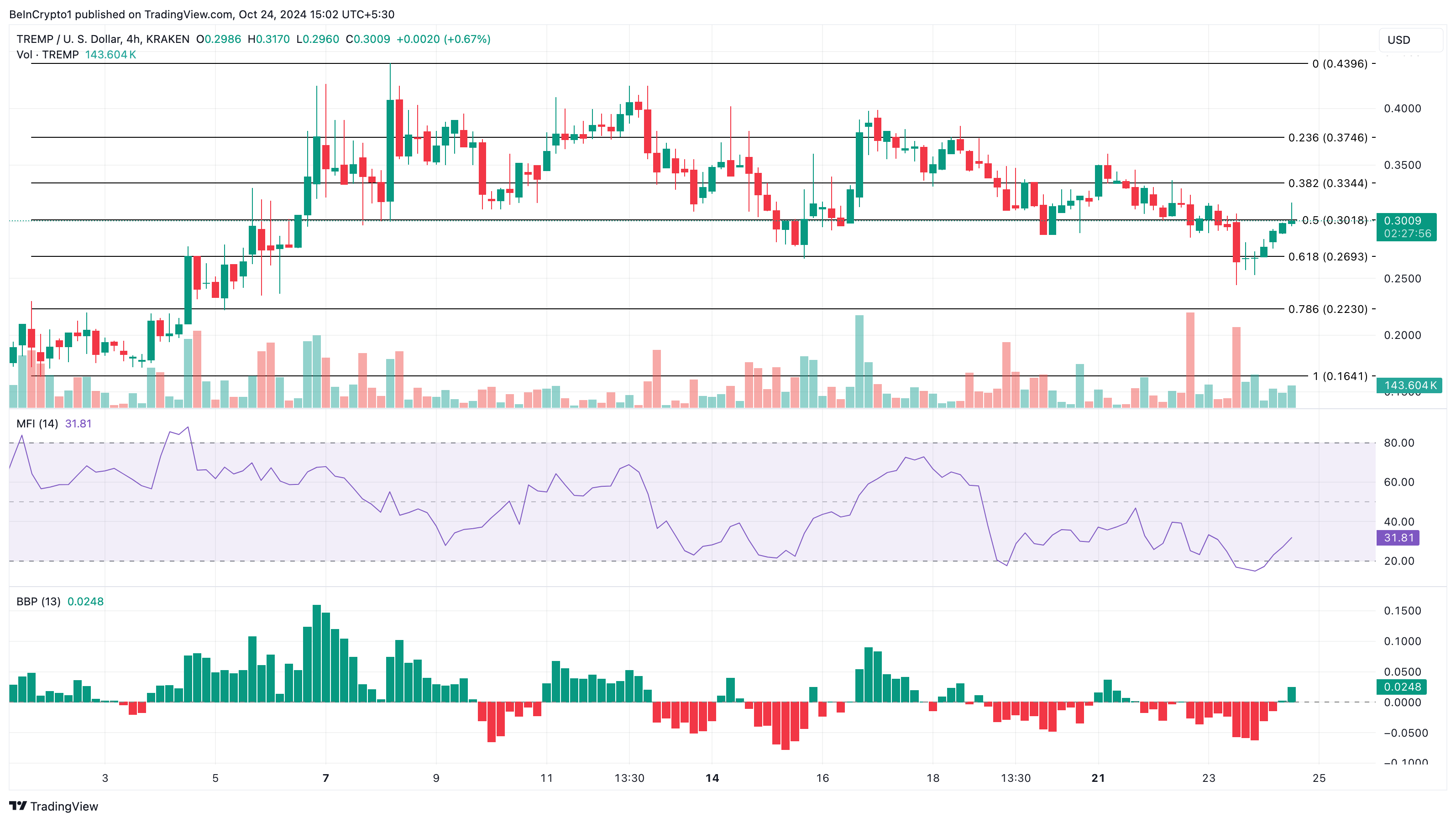 TREMP एक और Donald Trump-थीम वाला मीम कॉइन है जो पिछले सप्ताह में गिरावट आई है। इस समय लिखते समय, इसकी कीमत $0.30 है, जो सात दिन पहले की तुलना में 18% कम है।