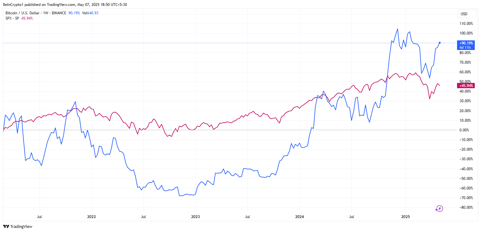 चार्ट सुझाव देता है कि Bitcoin का प्रदर्शन पारंपरिक इक्विटी बाजारों से अक्सर अलग रहा है, विशेष रूप से 2024-2025 में।