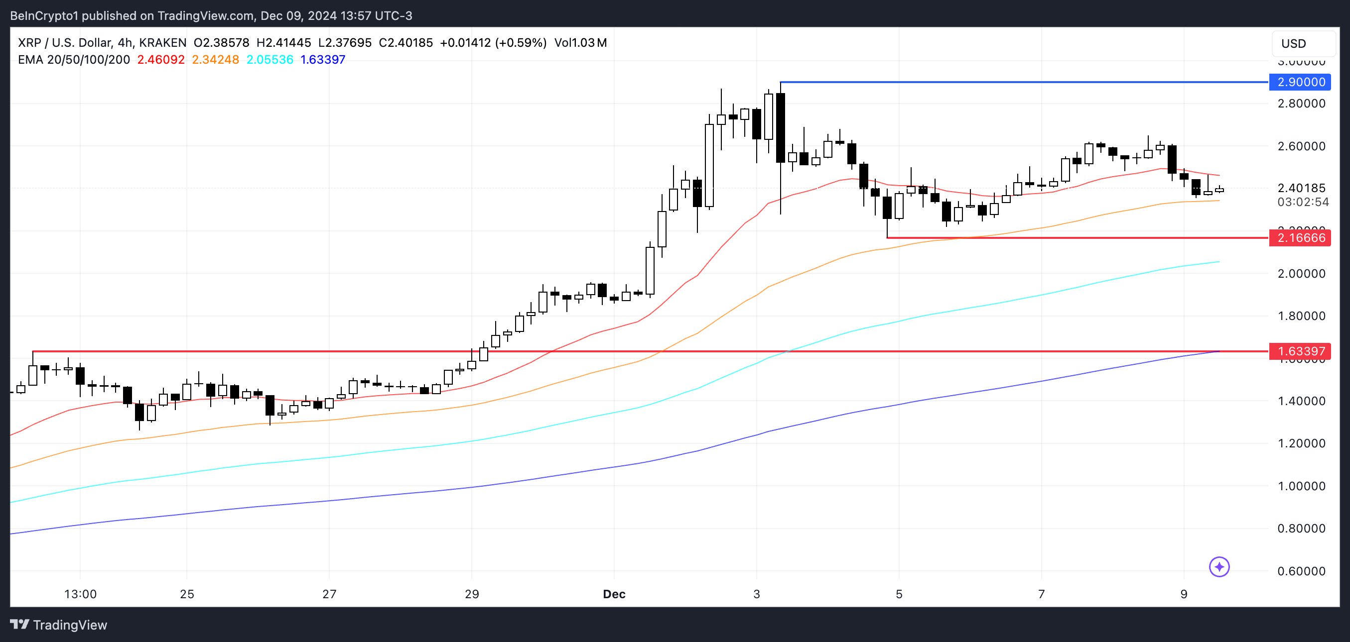 XRP का RSI वर्तमान में 46 पर है, जो 29 नवंबर से 3 दिसंबर के बीच 70 से ऊपर के ओवरबॉट स्तर से एक महत्वपूर्ण गिरावट है, जब इसकी कीमत लगभग $2.9 पर पहुंच गई थी, जो 2018 के बाद से सबसे अधिक थी।
