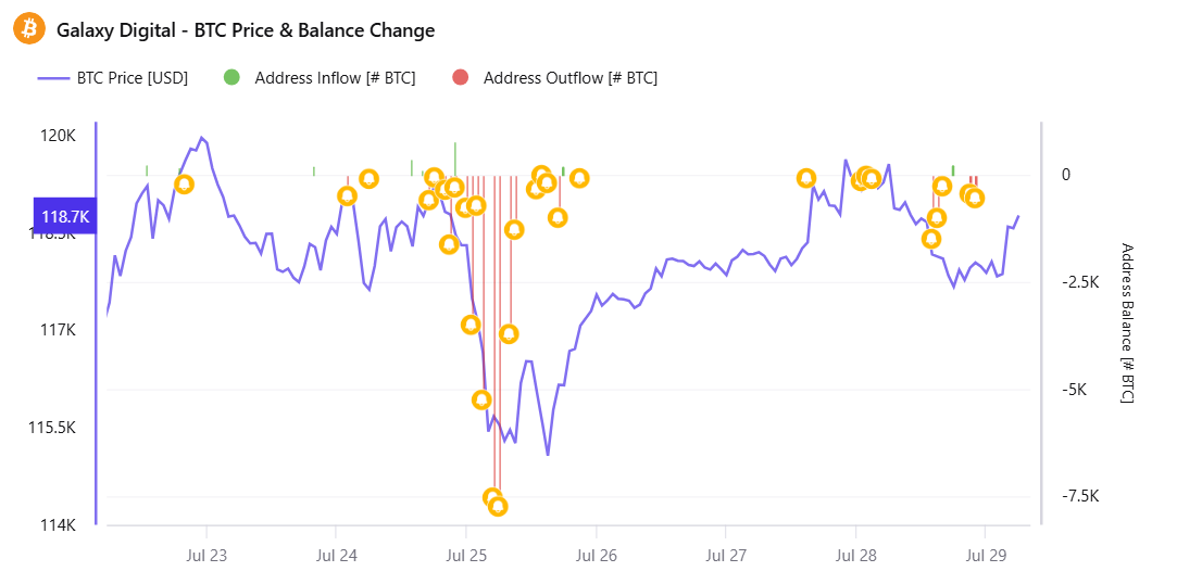 CryptoQuant डेटा दिखाता है कि Galaxy Digital वॉलेट्स से बड़े ऑउटफ्लो अक्सर Bitcoin प्राइस करेक्शन के साथ मेल खाते हैं। 29 जुलाई को, LookonChain ने अधिक ऑउटफ्लो का पता लगाया, जिससे एक और सेल-ऑफ़ की आशंका बढ़ गई।