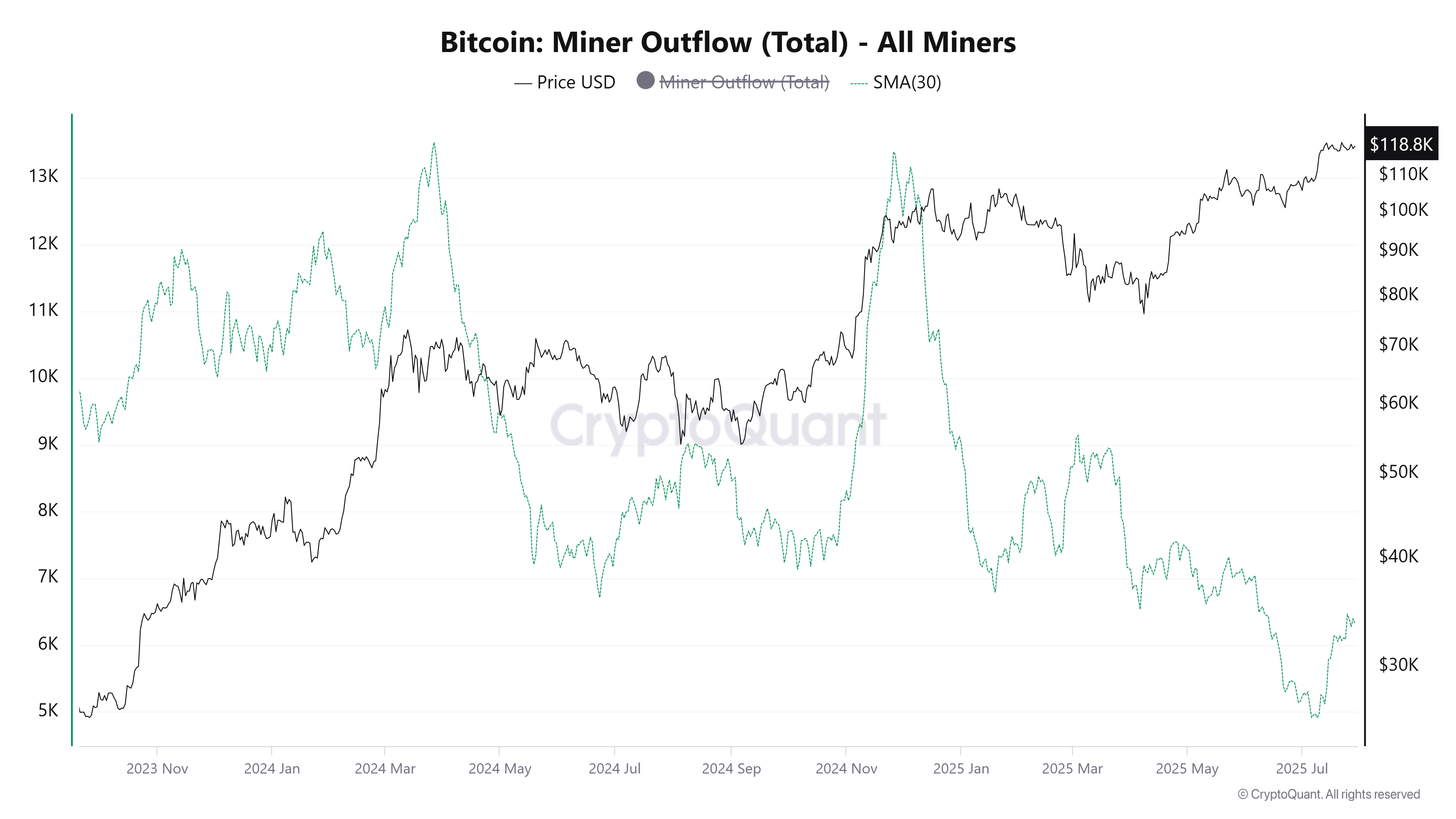 CryptoQuant के डेटा से पता चलता है कि जुलाई के दौरान, माइनर वॉलेट्स से BTC ऑउटफ्लो में गिरावट के बाद फिर से वृद्धि शुरू हो गई। यह बदलाव एक संभावित ट्रेंड रिवर्सल को दर्शाता है।