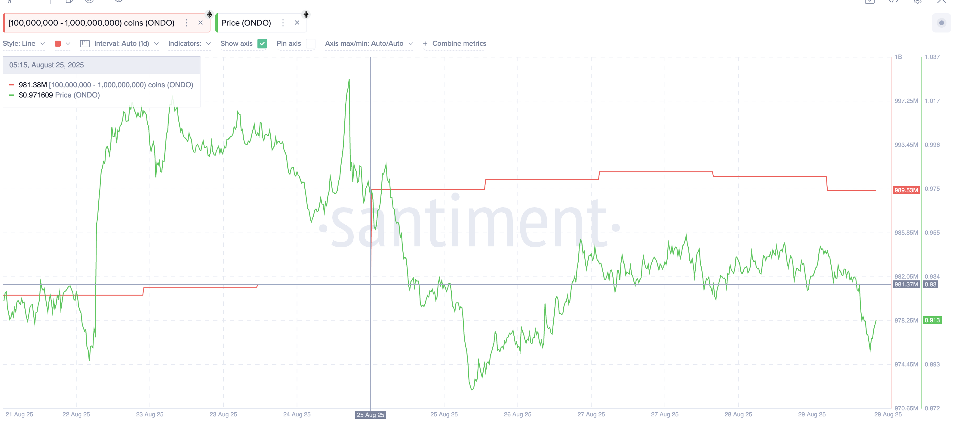व्हेल्स ने अगस्त के अंत में चुपचाप जोड़ना शुरू किया। 100 मिलियन से 1 बिलियन ONDO समूह ने 24 अगस्त को 981.38 मिलियन ONDO से होल्डिंग्स को बढ़ाकर प्रेस समय पर 989.53 मिलियन ONDO कर दिया। यह 8.15 मिलियन ONDO का संचय है, जो वर्तमान कीमतों पर लगभग $7.4 मिलियन के बराबर है, जो लगभग $0.91 है।