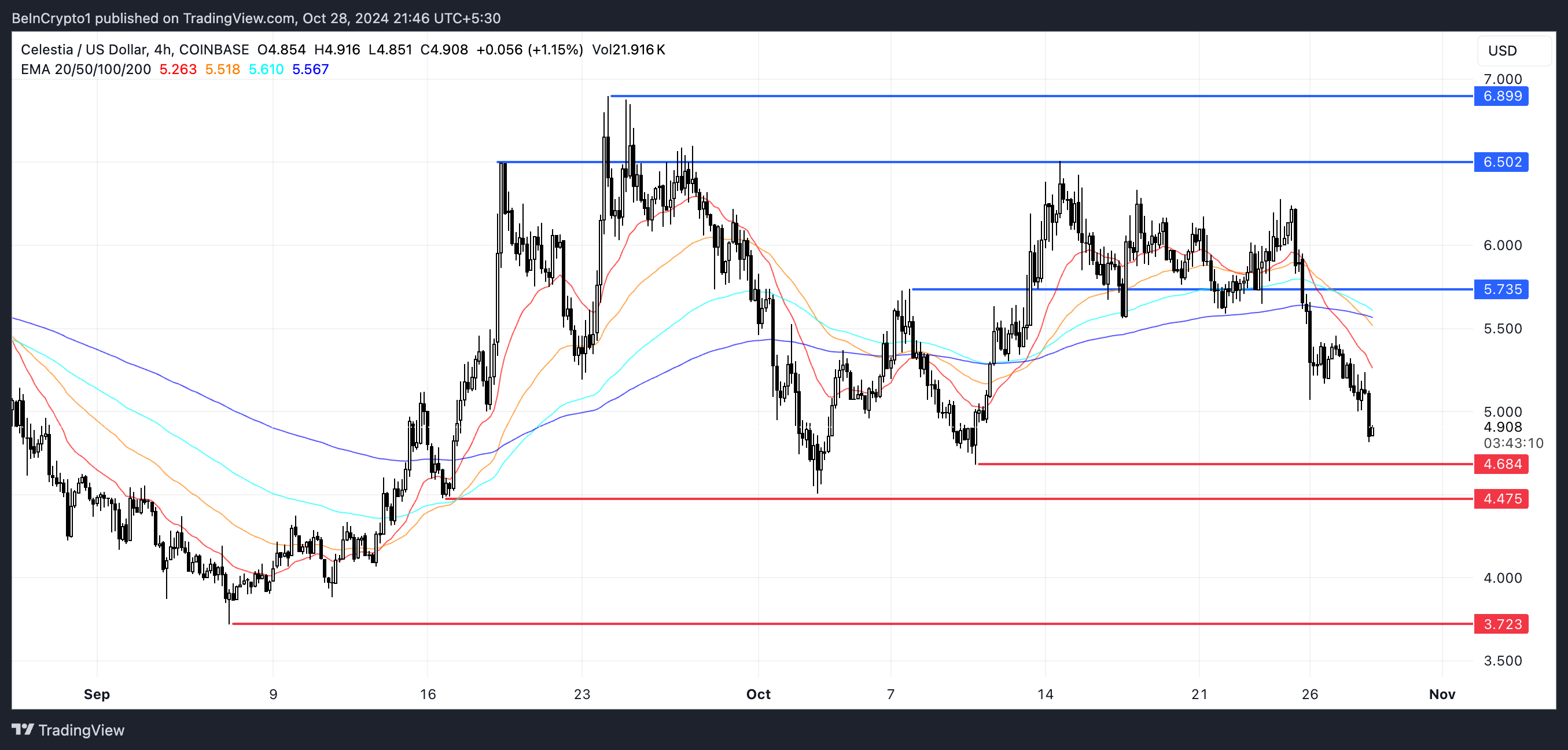 नीचे की ओर, तत्काल समर्थन स्तर लाल में $4.68 और $4.47 पर चिह्नित हैं। यदि बिक्री दबाव जारी रहता है और TIA अनलॉक कीमत को नीचे धकेलते हैं, तो TIA $3.72 तक गिर सकता है। यह एक संभावित 24% मूल्य सुधार का प्रतिनिधित्व करता है।