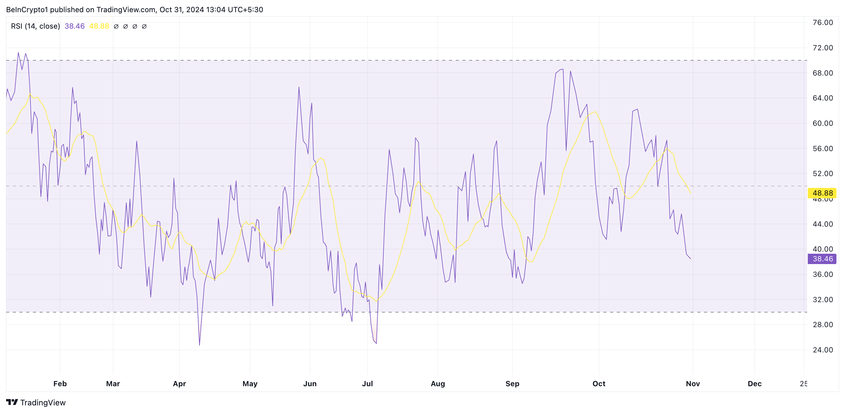 BeInCrypto की TIA/USD एक-दिन के चार्ट की समीक्षा से Celestia के 176 मिलियन टोकन अनलॉक के बाद बिक्री दबाव में वृद्धि की पुष्टि होती है। इस लेखन के समय, सिक्के का Relative Strength Index (RSI), जो ओवरसोल्ड और ओवरबॉट मार्केट कंडीशन्स को मापता है, 38.46 पर नीचे की ओर ट्रेंड में है। यह RSI रीडिंग संकेत देती है कि बाजार के प्रतिभागियों के बीच बिक्री दबाव खरीद गतिविधि से अधिक है।