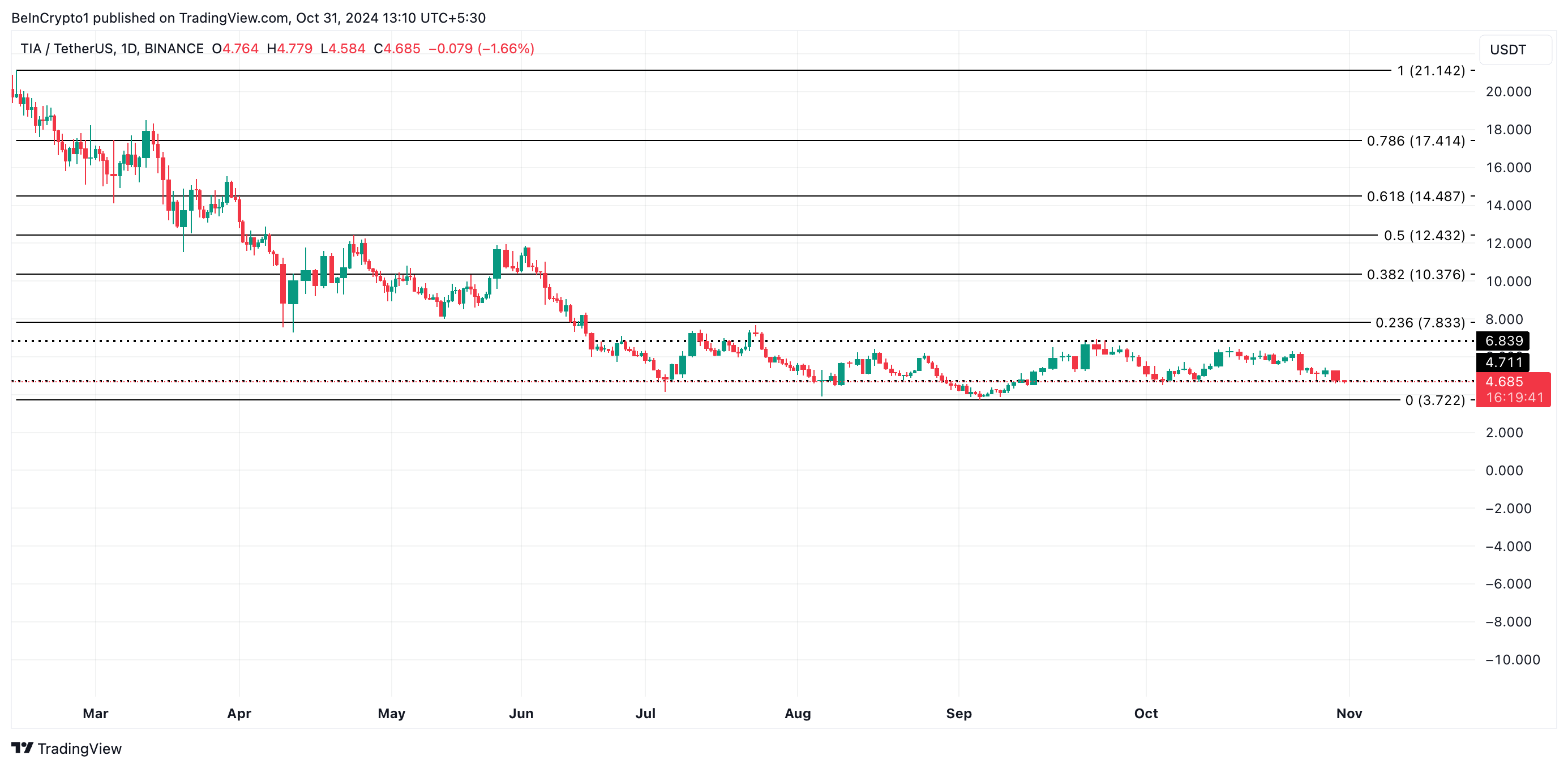 TIA वर्तमान में $4.68 पर ट्रेड कर रहा है, पिछले 24 घंटों में 9% की गिरावट आई है। यह गिरावट इसे जुलाई से स्थापित एक क्षैतिज चैनल के सपोर्ट लेवल के नीचे धकेल दिया है। इस रेंज में, ऊपरी सीमा $6.83 प्रतिरोध के रूप में काम करती है, जबकि $4.71 सपोर्ट लेवल को चिह्नित करता है।