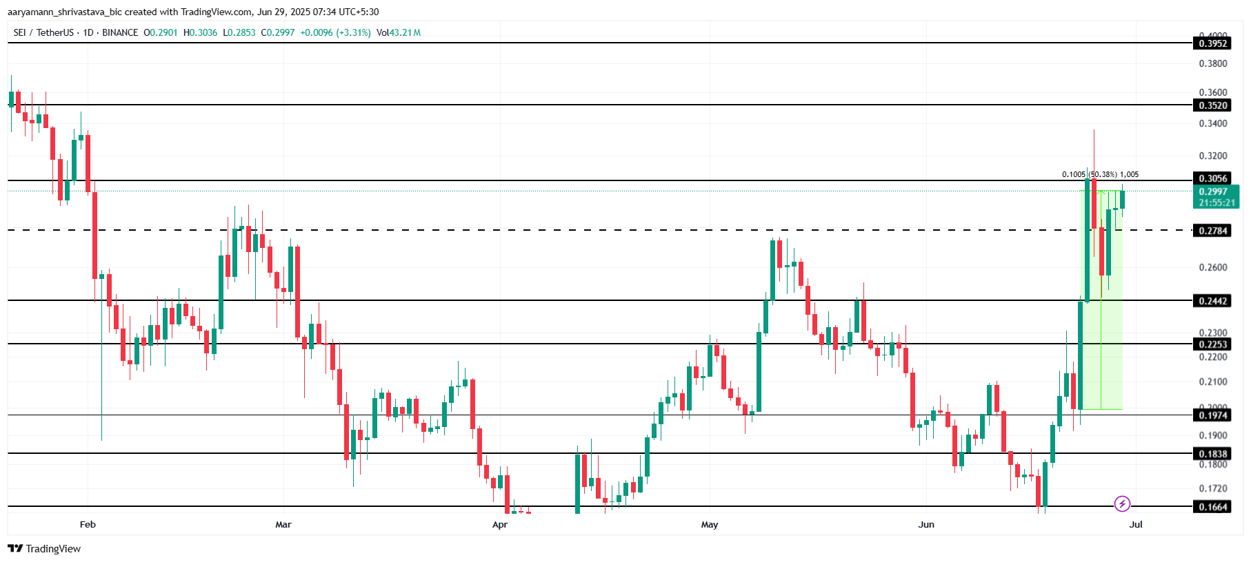 लेखन के समय, SEI $0.29 पर ट्रेड कर रहा है, जो $0.30 के मुख्य प्रतिरोध से थोड़ा नीचे है। यह पिछले सप्ताह में 50% की वृद्धि के बाद 4 महीने का उच्चतम स्तर है।