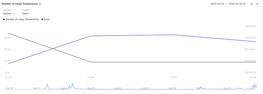 इसके अलावा, समीक्षा की अवधि के दौरान, SHIB से संबंधित बड़े ट्रांजैक्शन्स की संख्या में वृद्धि हुई है, जो संस्थागत प्लेयर्स और व्हेल्स से बढ़ी हुई गतिविधि का संकेत देती है। IntoTheBlock के डेटा के अनुसार, बड़े ट्रांजैक्शन्स—जो $100,000 से अधिक हैं—में महत्वपूर्ण वृद्धि हुई है। पिछले सप्ताह के दौरान, ऐसे ट्रांजैक्शन्स की दैनिक संख्या 200% से अधिक बढ़ गई है, जो प्रमुख निवेशकों से नए सिरे से रुचि को दर्शाती है।
