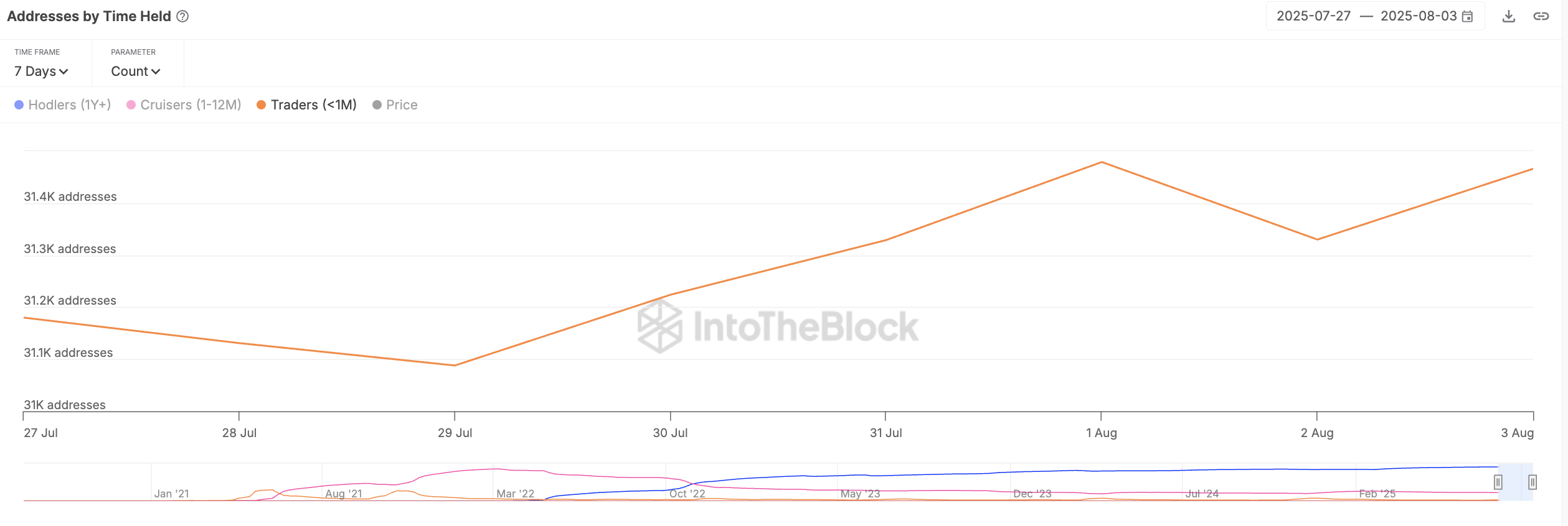 इसके अलावा, व्हेल गतिविधि में वृद्धि आमतौर पर रिटेल ट्रेडर्स को भी ऐसा करने के लिए प्रेरित करती है, जो कि वास्तव में हो रहा है। IntoTheBlock के डेटा के अनुसार, शॉर्ट-टर्म होल्डर्स की संख्या, जो अपनी होल्डिंग समय को बढ़ा रहे हैं, पिछले सात दिनों में मामूली 1% बढ़ी है।