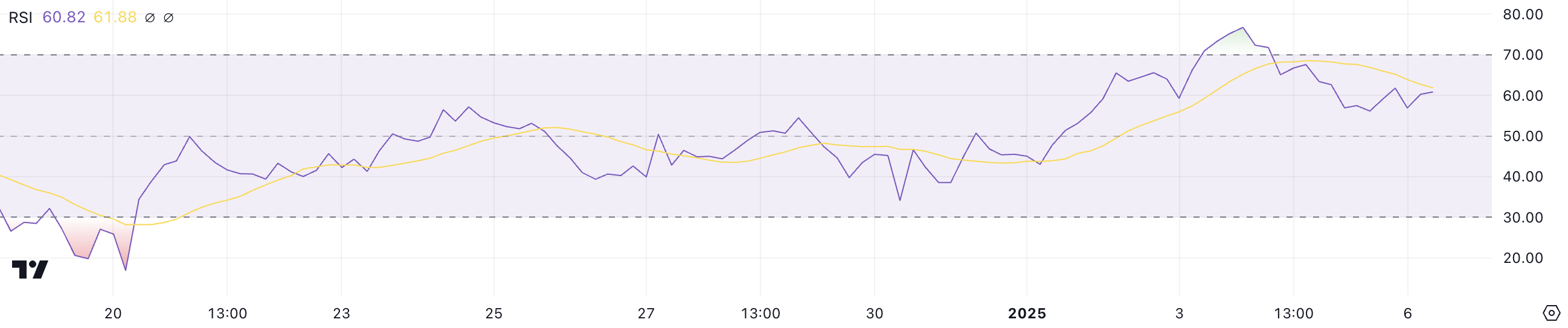 Shiba Inu रिलेटिव स्ट्रेंथ इंडेक्स (RSI) वर्तमान में 60.8 पर है, जो 5 जनवरी को 56 पर गिरने के बाद 3 जनवरी को 76 पर पहुंचने के बाद रिकवर कर रहा है। RSI एक मोमेंटम इंडिकेटर है जो 0 से 100 के स्केल पर प्राइस मूवमेंट्स की स्पीड और मैग्निट्यूड को मापता है।