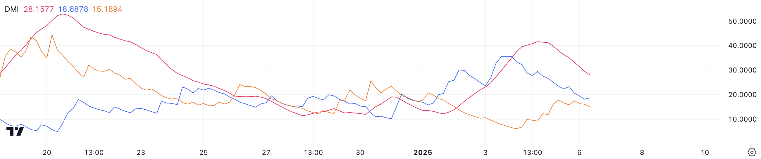 SHIB का एवरेज डायरेक्शनल इंडेक्स (ADX) वर्तमान में 28.1 पर है, जो दो दिन पहले 41.6 से काफी नीचे है। ADX 0 से 100 के स्केल पर एक ट्रेंड की स्ट्रेंथ को मापता है, जिसमें 25 से ऊपर के वैल्यूज एक स्ट्रॉन्ग ट्रेंड को इंगित करते हैं और 20 से नीचे के वैल्यूज कमजोर या अनुपस्थित मोमेंटम को दर्शाते हैं।