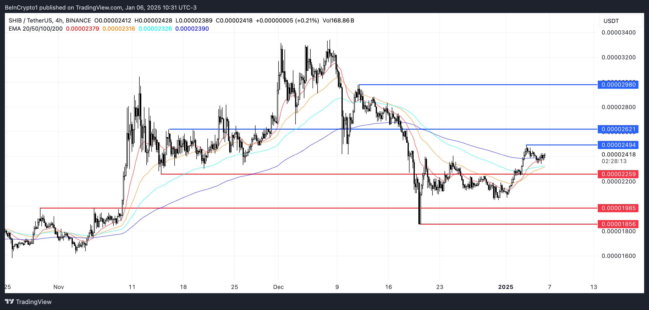 Shiba Inu EMA लाइन्स संकेत देती हैं कि एक गोल्डन क्रॉस क्षितिज पर हो सकता है, क्योंकि सबसे शॉर्ट-टर्म EMA सबसे लॉन्ग-टर्म EMA के ऊपर क्रॉसओवर के करीब है। यह संभावित बुलिश संकेत खरीदारी की मोमेंटम को फिर से जगा सकता है, जिससे SHIB $0.0000249 के रेजिस्टेंस का परीक्षण कर सके।