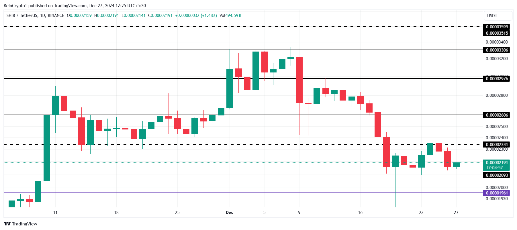 Shiba Inu को बुलिश मोमेंटम फिर से हासिल करने में संघर्ष करना पड़ा है, और इसके प्राइस चार्ट में सीमित रिकवरी प्रयास दिखाई दे रहे हैं। यह मीम कॉइन हाल के नुकसान को रिकवर करने में असमर्थ है, जिससे यह अपने पिछले उच्च स्तरों से काफी नीचे है।