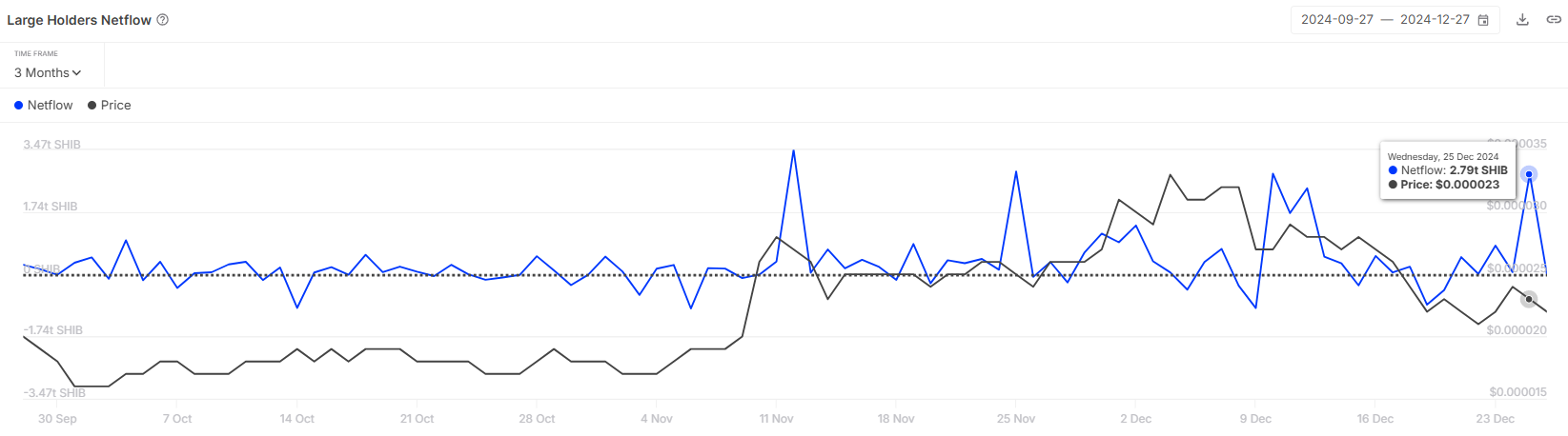 Shiba Inu व्हेल्स शॉर्ट-टर्म बुलिश संभावनाओं का लाभ उठाते हुए दिखाई दे रहे हैं। एक उल्लेखनीय ट्रांजैक्शन में, SHIB की सप्लाई का कम से कम 0.1% रखने वाले एड्रेसेस ने 24 घंटों के भीतर 2.79 ट्रिलियन SHIB खरीदे, जिनकी कीमत $60 मिलियन से अधिक थी। इस तरह की महत्वपूर्ण एकत्रीकरण बड़े धारकों की संभावित प्राइस वृद्धि की प्रत्याशा में नए सिरे से रुचि को दर्शाता है।
