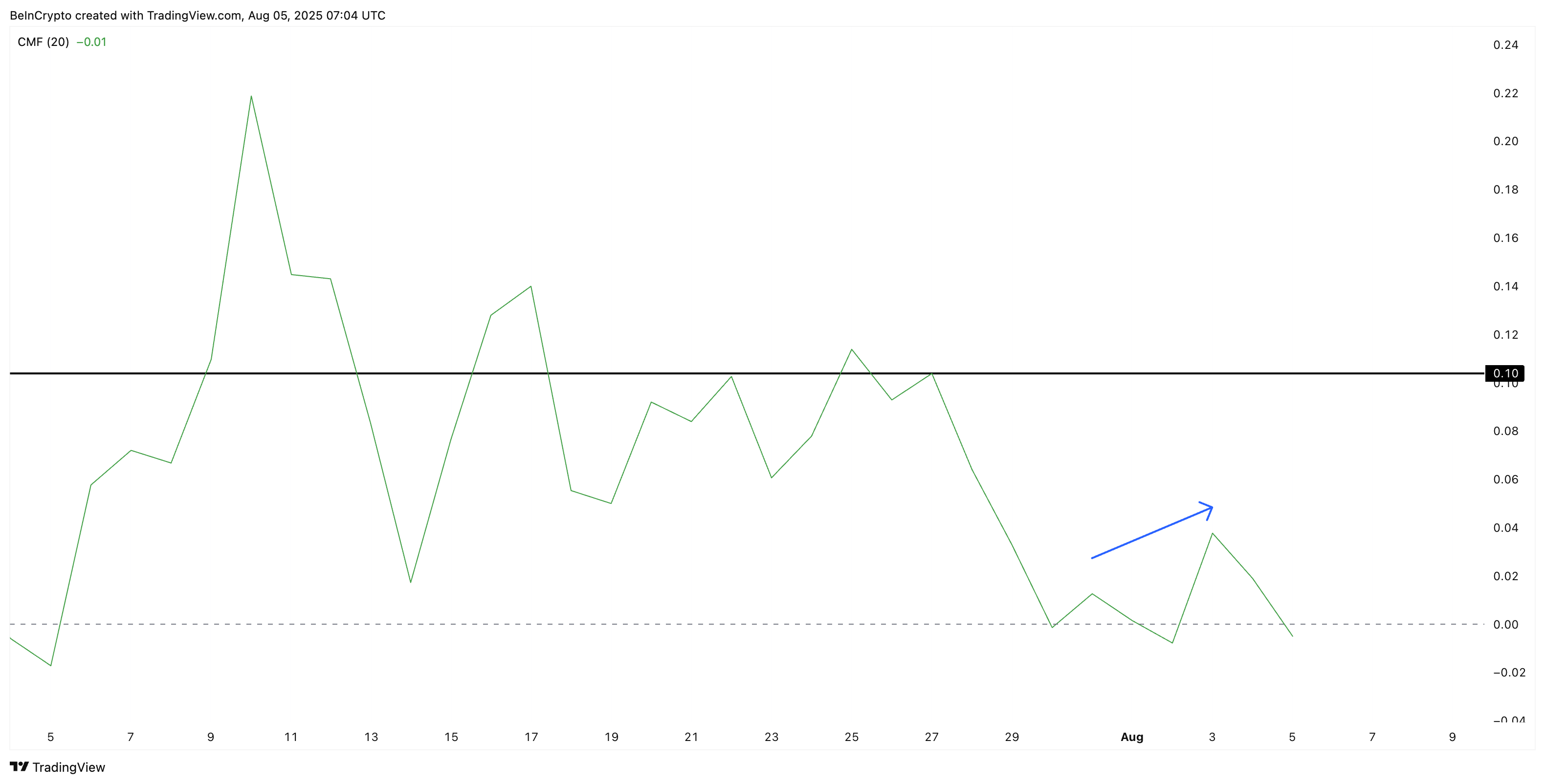 Chaikin Money Flow (CMF), जो वॉल्यूम और प्राइस मूवमेंट के आधार पर खरीद और बिक्री के दबाव को ट्रैक करता है, बुलिश डाइवर्जेंस दिखा रहा है। 31 जुलाई को, CMF ने एक उच्चतम स्तर पर पहुंचने के बाद थोड़ी देर के लिए पीछे हट गया। 3 अगस्त तक, इसने एक नया उच्चतम स्तर प्रिंट किया, भले ही SHIB प्राइस ने उसी अवधि के दौरान एक निचला स्तर बनाया।