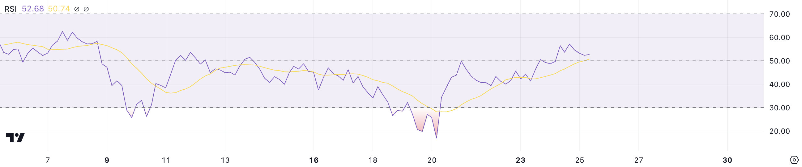 RSI, एक मोमेंटम ऑसिलेटर, 0 से 100 के पैमाने पर प्राइस परिवर्तनों की गति और परिमाण को मापता है। 70 से ऊपर के मान ओवरबॉट कंडीशंस को इंगित करते हैं, जो प्राइस करेक्शन का कारण बन सकते हैं, जबकि 30 से नीचे के मान ओवरसोल्ड कंडीशंस का संकेत देते हैं, जो अक्सर एक रिबाउंड से पहले होते हैं।