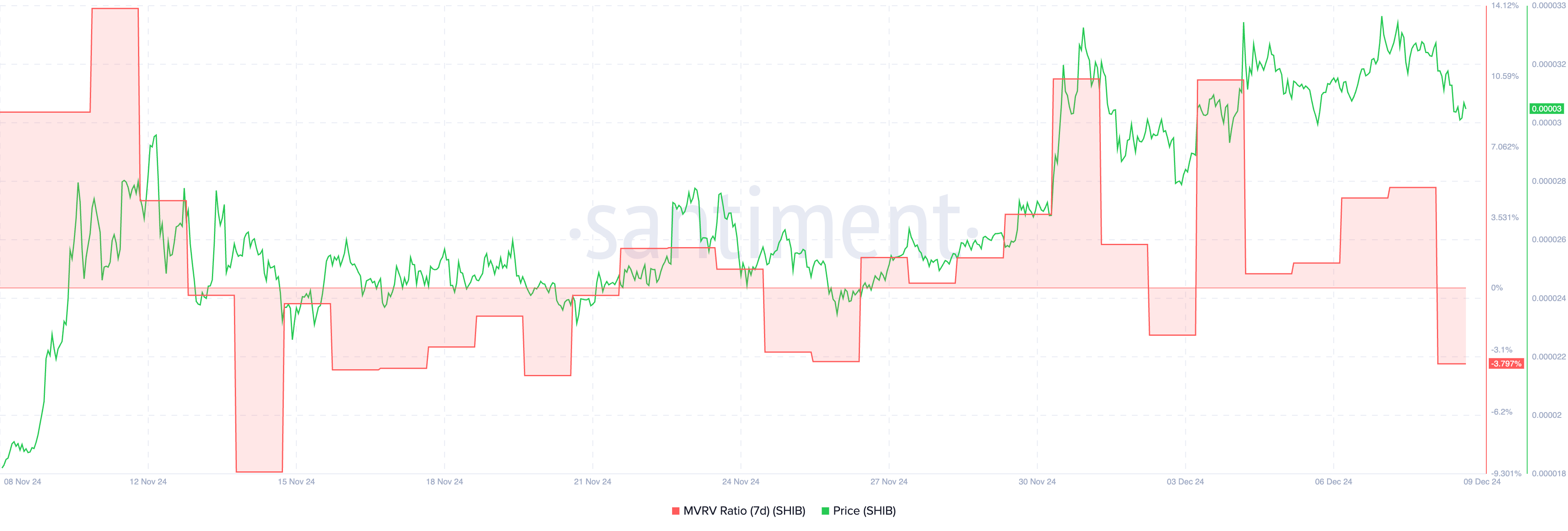 शिबा इनु का 7-दिन MVRV वर्तमान में -3.79% पर है, जो एक दिन पहले 5% था।