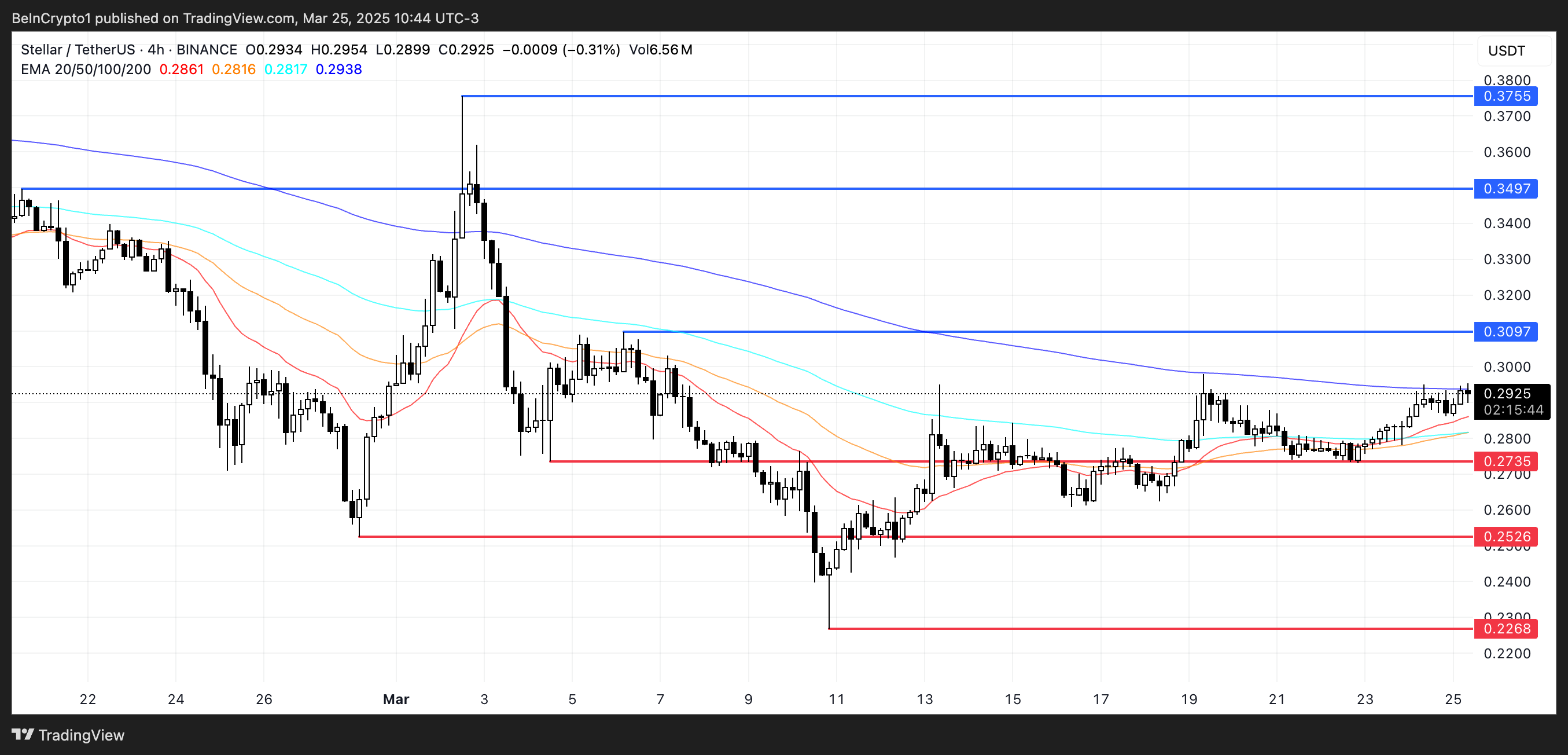 Stellar की EMA लाइनों में संभावित उछाल के संकेत दिख रहे हैं, जिसमें शॉर्ट-टर्म मूविंग एवरेज लंबे समय की लाइनों के ऊपर क्रॉसओवर के करीब हैं।