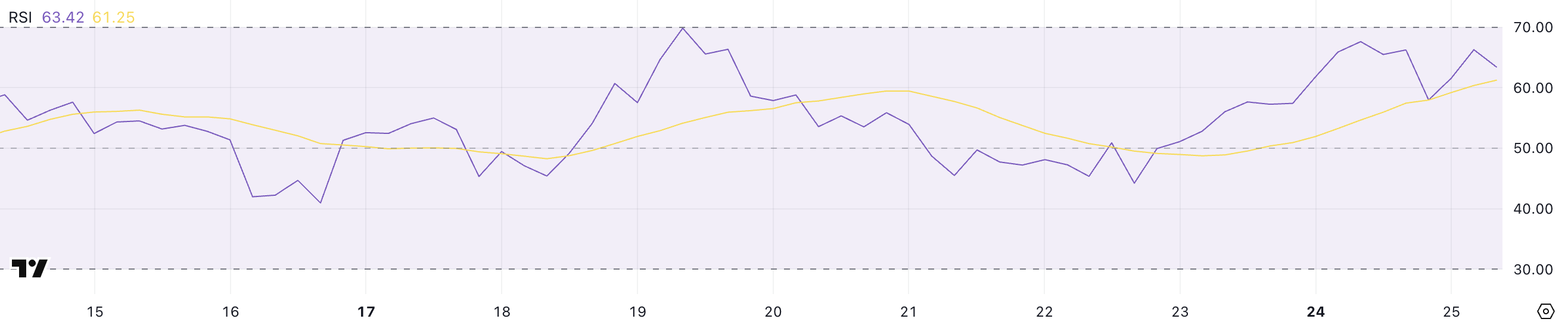 RSI स्केल 0 से 100 तक होता है, जिसमें 70 से ऊपर के मूल्य इंगित करते हैं कि एसेट ओवरबॉट हो सकता है और करेक्शन के लिए तैयार है, और 30 से नीचे के रीडिंग ओवरसोल्ड स्थितियों और रिबाउंड की संभावना का संकेत देते हैं। आमतौर पर, 50 और 70 के बीच के मूल्य मॉडरेट बुलिश मोमेंटम का सुझाव देते हैं, जबकि 30 से 50 का मतलब बियरिश होता है।