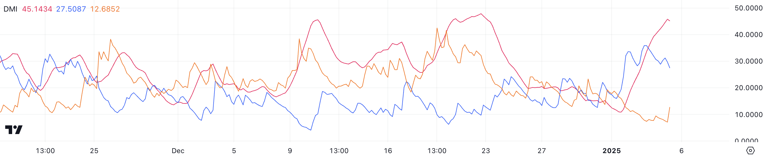 SOL के लिए Average Directional Index (ADX) 45 तक बढ़ गया है, जो चार दिन पहले 10.8 से तेजी से बढ़ा है, जो एक मजबूत ट्रेंड फॉर्मेशन का संकेत देता है। ADX 0 से 100 के पैमाने पर एक ट्रेंड की ताकत को मापता है, जहां 25 से ऊपर के मान एक मजबूत ट्रेंड का संकेत देते हैं, जबकि 20 से नीचे के मान कमजोर या अनुपस्थित मोमेंटम का सुझाव देते हैं।