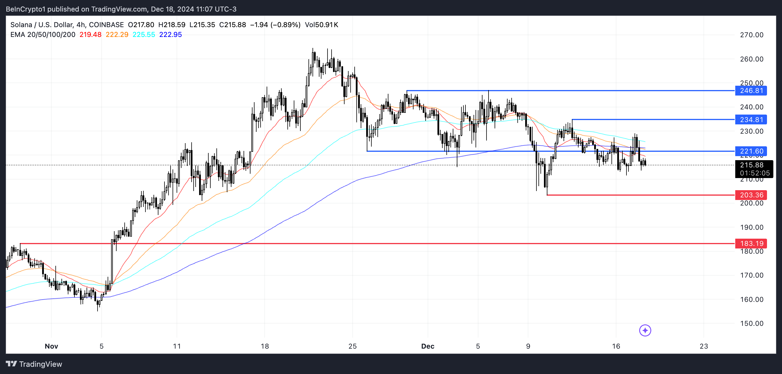Solana EMA लाइन्स वर्तमान में एक bearish कॉन्फ़िगरेशन में हैं, जिसमें शॉर्ट-टर्म EMAs लॉन्ग-टर्म EMAs के नीचे स्थित हैं, जो 15 दिसंबर को एक डेथ क्रॉस की पुष्टि करते हैं। यह पैटर्न आमतौर पर निरंतर डाउनसाइड momentum का संकेत देता है, और यदि ट्रेंड जारी रहता है, तो SOL $203 सपोर्ट लेवल का परीक्षण कर सकता है।
