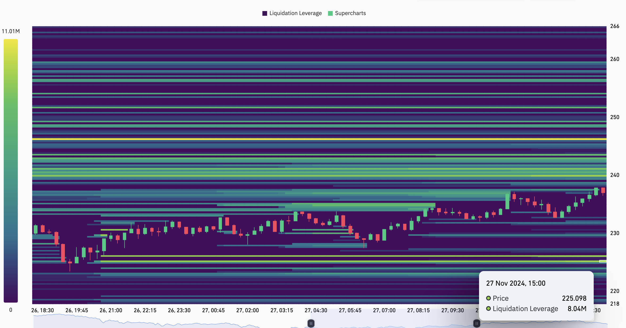 उदाहरण के लिए, यदि किसी विशेष क्षेत्र में लिक्विडिटी की उच्च सांद्रता है, तो हीटमैप का रंग बैंगनी से पीला हो जाता है। अधिकांश मामलों में, इस रंग परिवर्तन का मतलब होता है कि क्रिप्टोकरेंसी की कीमत उस क्षेत्र की ओर बढ़ सकती है। दूसरी ओर, यदि सांद्रता कम है, तो रंग बैंगनी ही रहता है।