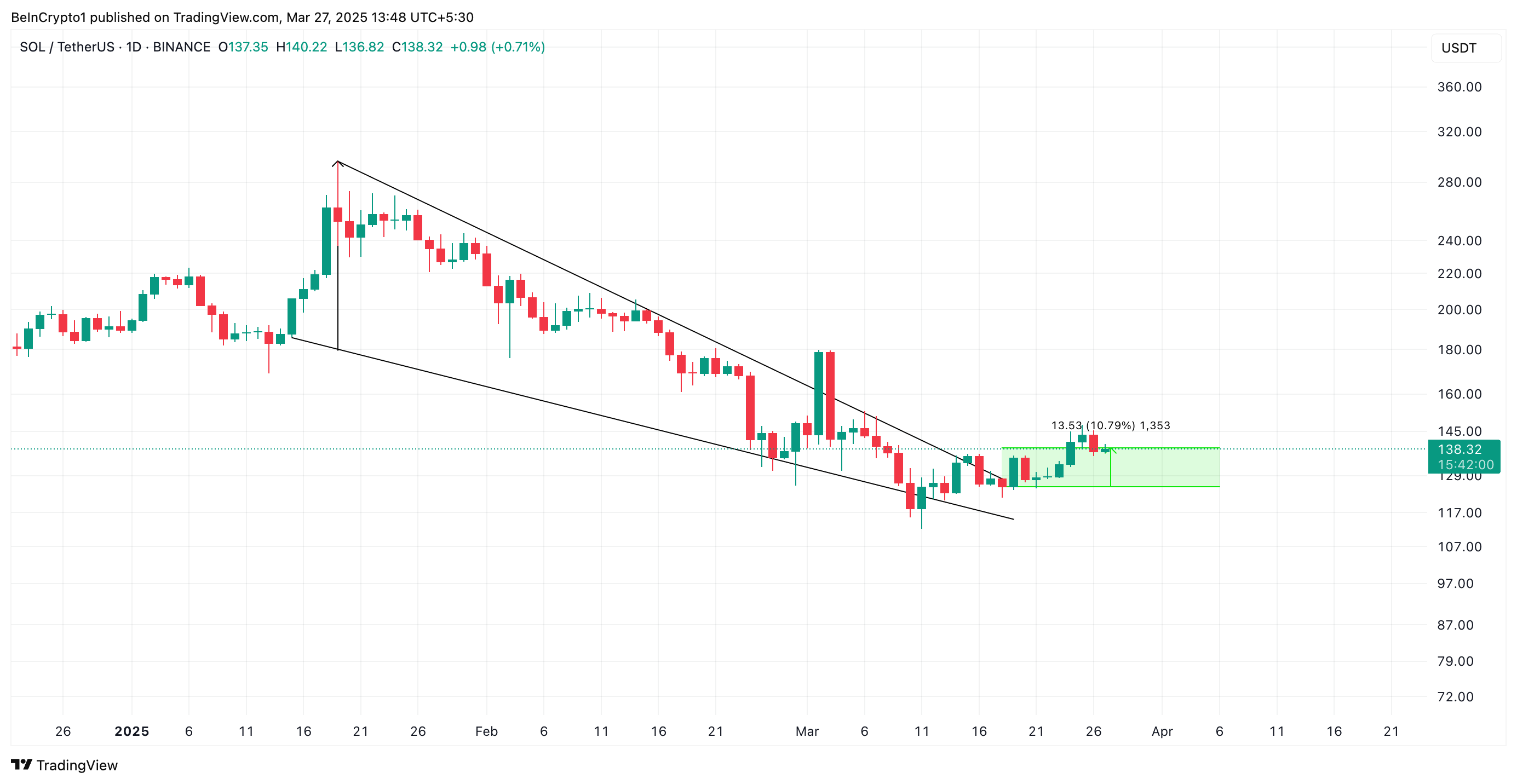 आमतौर पर, जब कोई एसेट एक गिरते हुए वेज पैटर्न से बाहर निकलता है, तो इसकी कीमत वेज की अधिकतम ऊंचाई के बराबर बढ़ने की उम्मीद होती है। अगर ऐसा होता है, तो SOL की कीमत 67% बढ़कर $230.22 पर पहुंच सकती है।