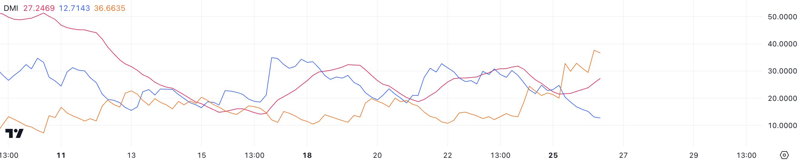 SOL DMI चार्ट दिखाता है कि इसका ADX कल के 21 से बढ़कर 27.24 हो गया है, जो एक मजबूत होती ट्रेंड गति का संकेत देता है। ADX, या एवरेज डायरेक्शनल इंडेक्स, एक ट्रेंड की ताकत को मापता है, जिसमें 25 से ऊपर के मान एक महत्वपूर्ण ट्रेंड का संकेत देते हैं, चाहे वह बुलिश हो या बियरिश।