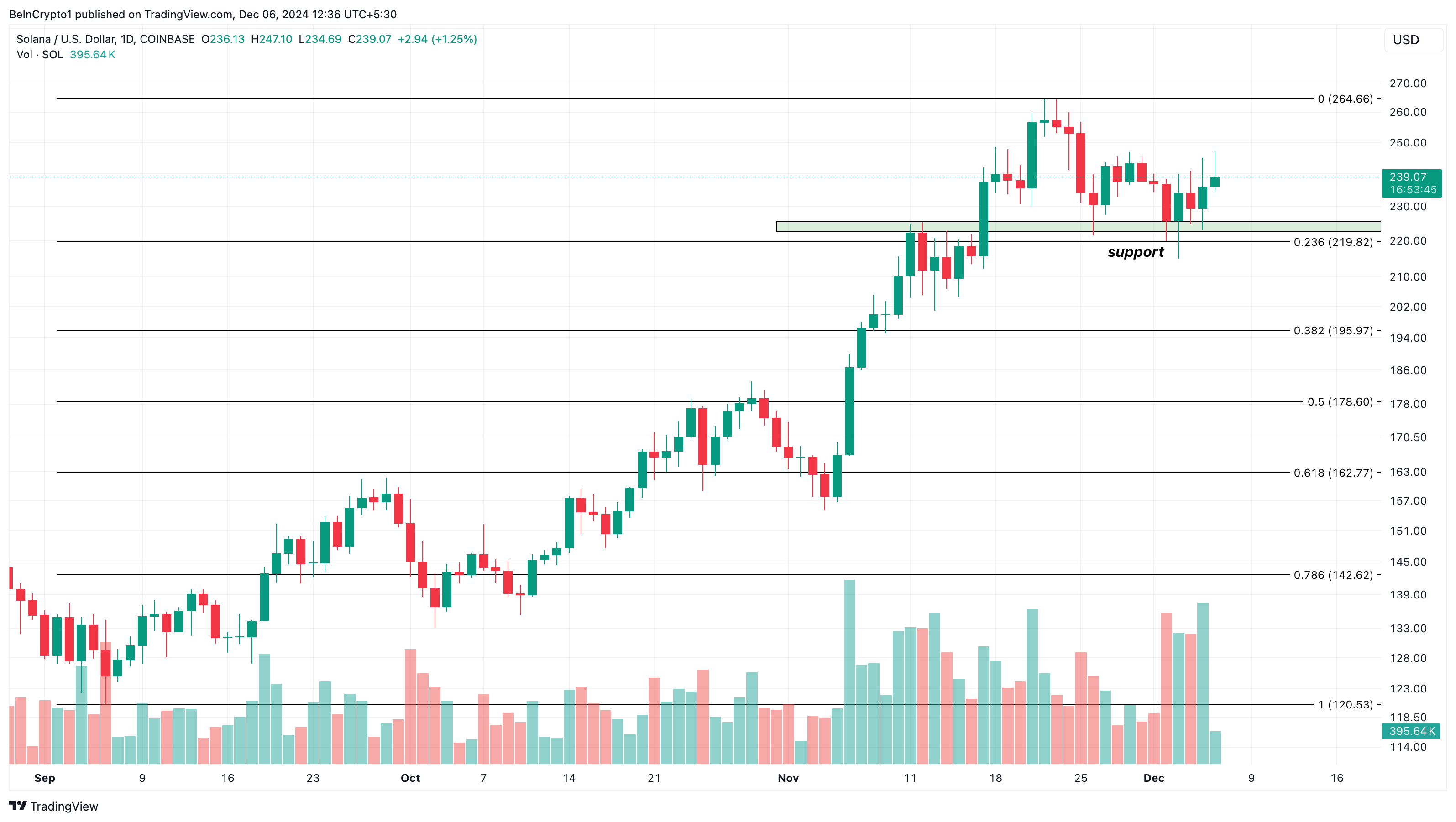 डेली चार्ट पर, SOL बुल्स $226 पर सपोर्ट को डिफेंड करते दिख रहे हैं। 17 नवंबर को, जब बुल्स ने सपोर्ट को बनाए रखा, तो Solana की कीमत $264 तक बढ़ गई।