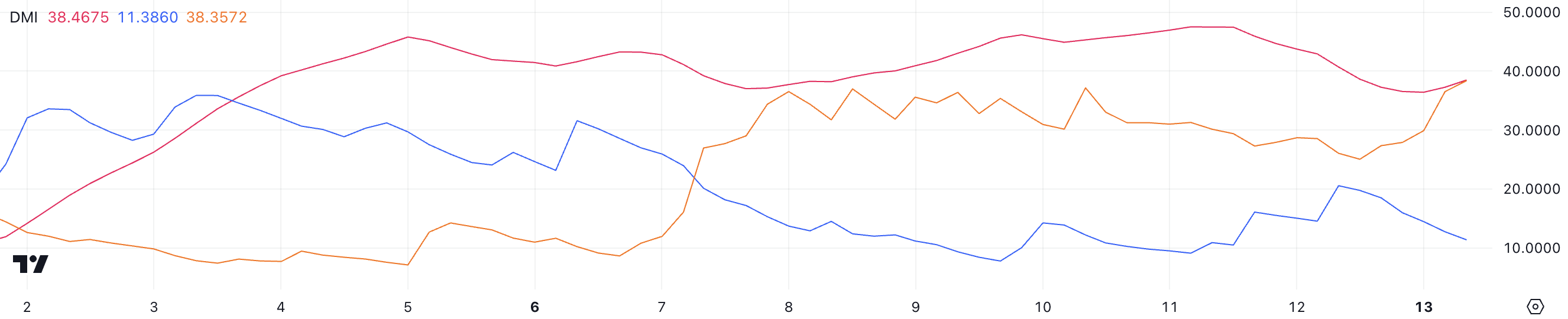 SOL DMI चार्ट इसका ADX 38.4 पर दिखाता है, जो एक मजबूत ट्रेंड को इंगित करता है। ADX (एवरेज डायरेक्शनल इंडेक्स) एक ट्रेंड की ताकत को मापता है बिना उसकी दिशा को निर्दिष्ट किए।