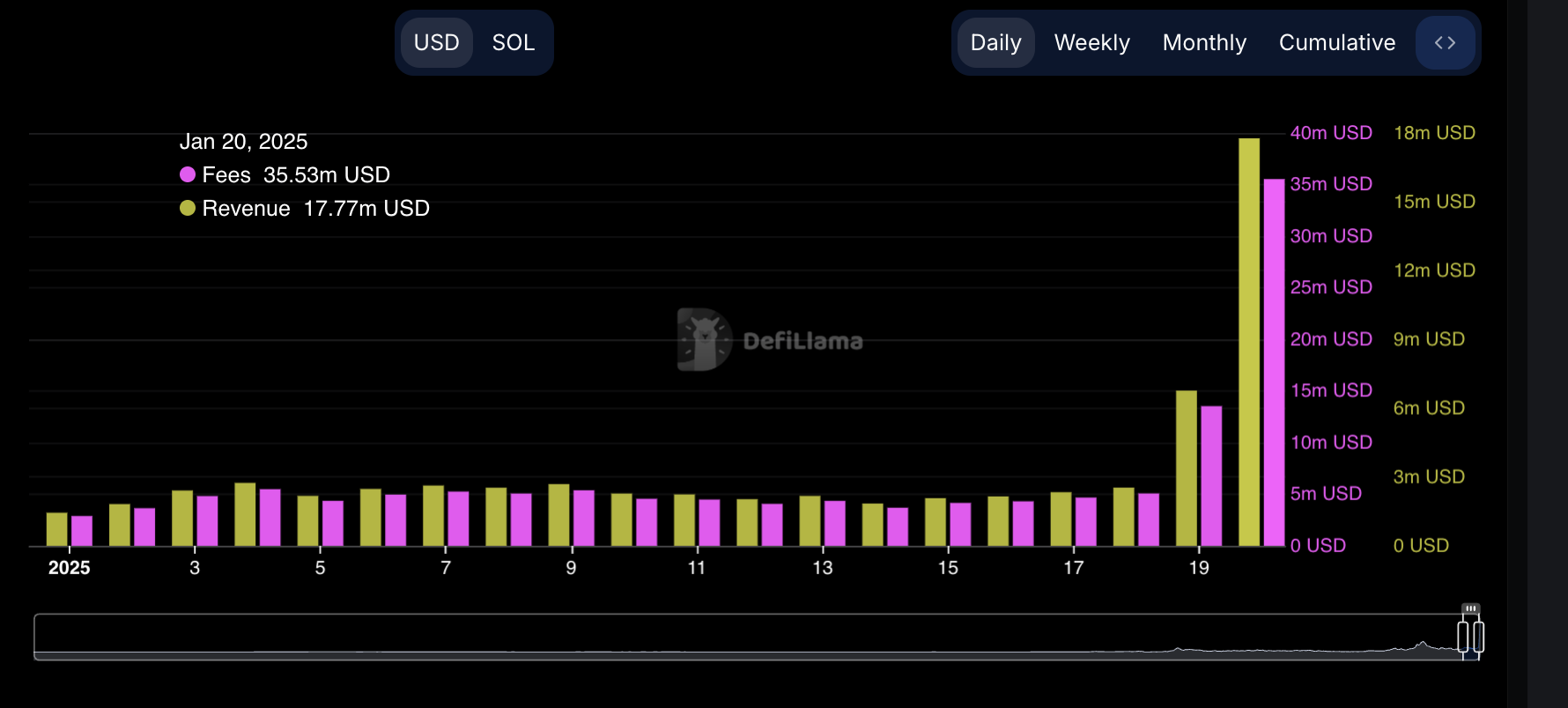 DefiLlama के अनुसार, सोमवार को Solana की दैनिक नेटवर्क फीस कुल $36 मिलियन है, जो पिछले दिन के $13 मिलियन से 176% की वृद्धि है। इसी तरह, इन फीस से प्राप्त राजस्व $18 मिलियन है, जो रविवार के $6 मिलियन से 200% की वृद्धि है।