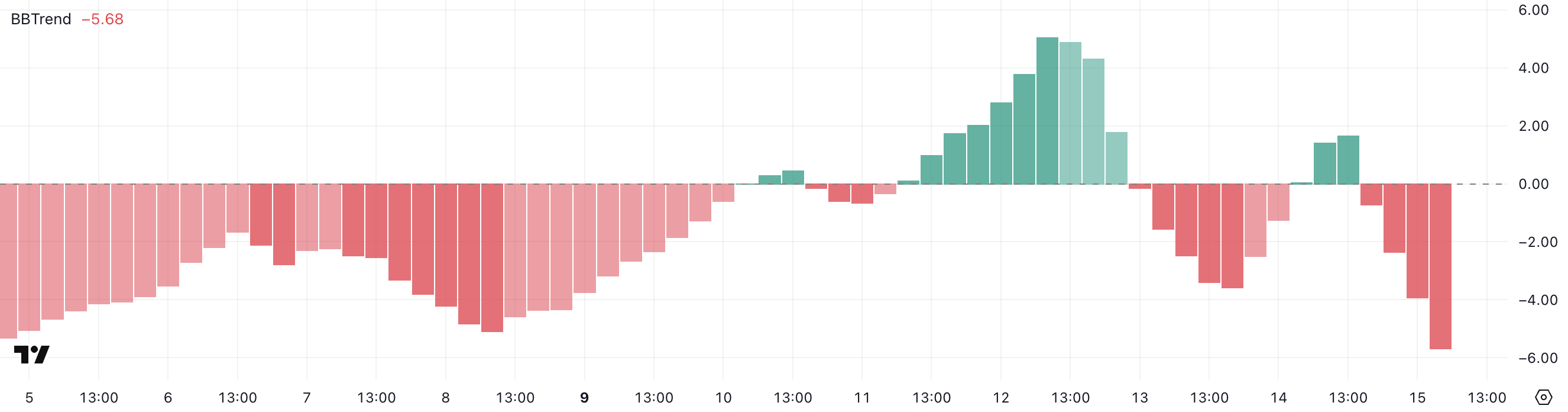 BBTrend (Bollinger Band Trend) प्राइस मूवमेंट की ताकत और दिशा को Bollinger Bands के सापेक्ष मापता है।
