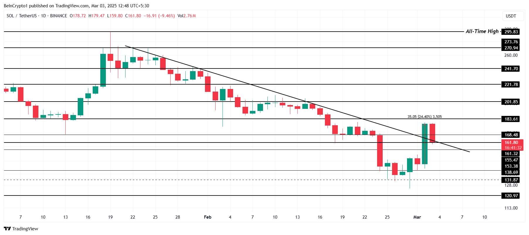 Solana ने पिछले महीने में लगातार गिरावट का सामना किया है, जिससे निवेशकों का विश्वास हिल गया है। हालांकि, 24% की वृद्धि यह संकेत देती है कि सबसे बुरा समय शायद खत्म हो गया है। SOL अब $161 पर ट्रेड कर रहा है, जो संभावित रिकवरी का संकेत देता है।
