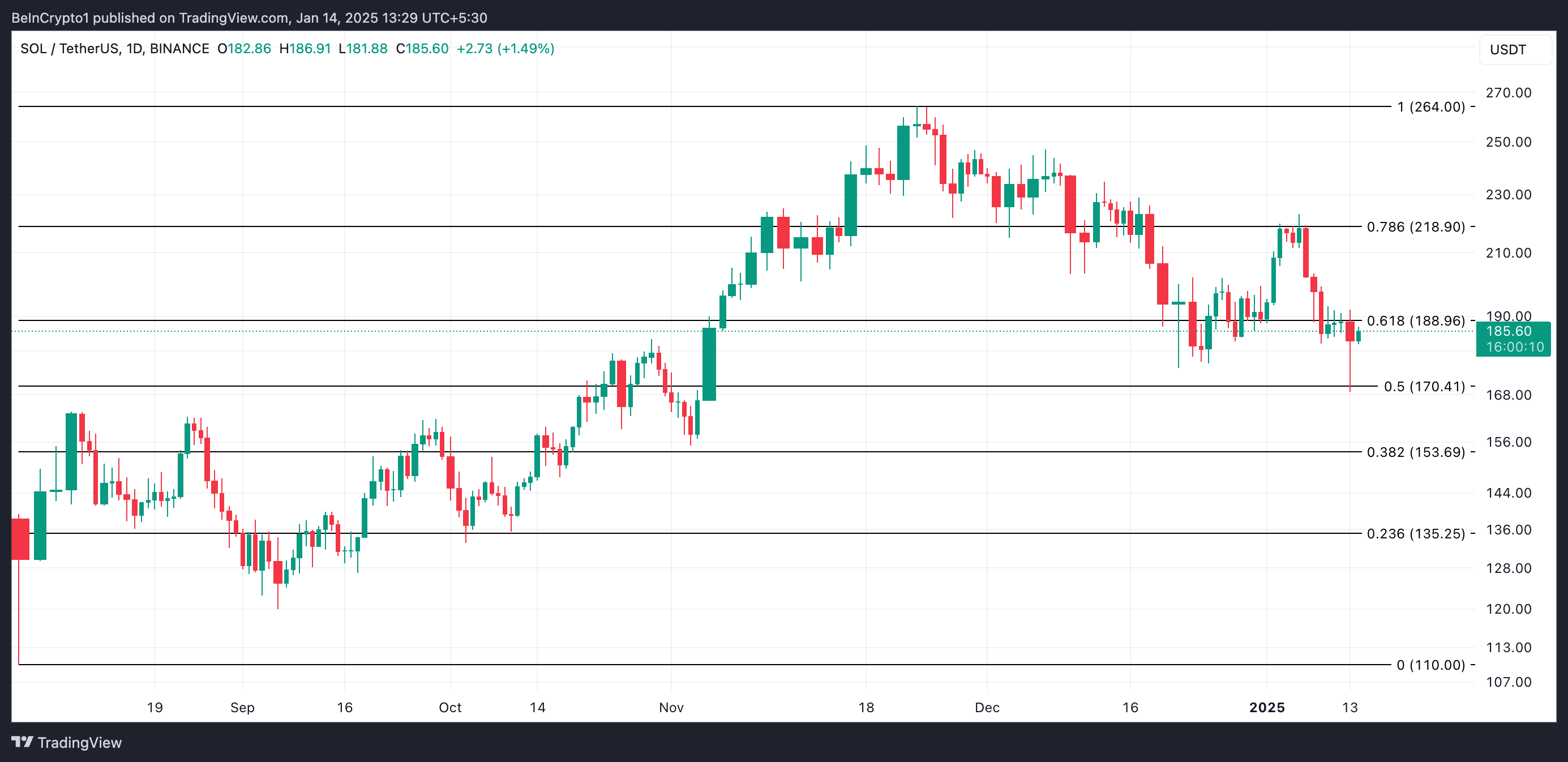 बढ़ते मंदी के दबाव के साथ, SOL को महत्वपूर्ण $188.96 प्रतिरोध स्तर को पार करने में कठिनाई हो सकती है। अगर सेल-ऑफ़ तेज होते हैं और SOL अपनी डाउनवर्ड ट्रेंड को फिर से शुरू करता है, तो इसकी कीमत $170.41 तक गिर सकती है, जिससे अधिक लॉन्ग पोजीशन्स का लिक्विडेशन हो सकता है।