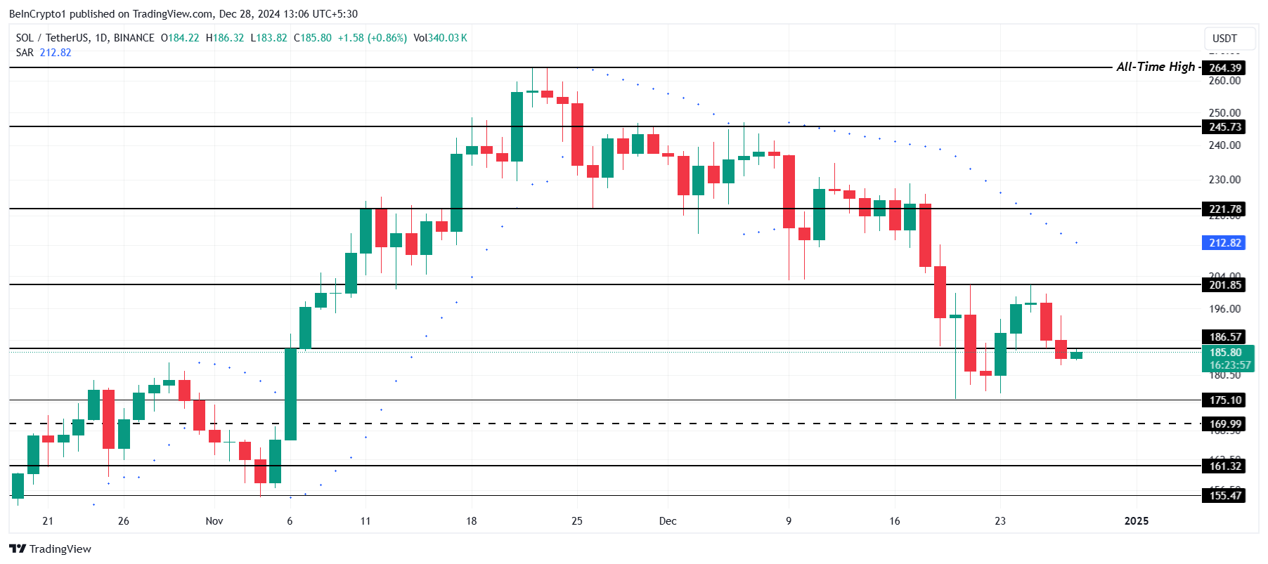 $175 के सपोर्ट स्तर के ऊपर मंडराते हुए, Solana एक अस्थिर स्थिति में बनी हुई है। इस सपोर्ट को खोने से altcoin को एक करेक्शन का सामना करना पड़ सकता है, जिसमें $155 अगला महत्वपूर्ण सपोर्ट स्तर बनकर उभर सकता है। ऐसी गिरावट मंदी की भावना को गहरा करेगी और किसी भी रिकवरी प्रयासों में देरी करेगी।