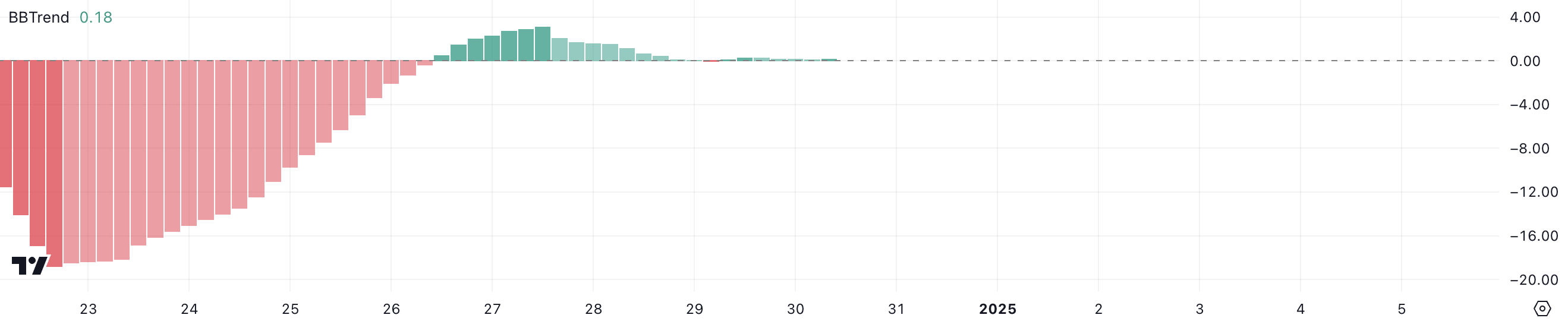 SOL BBTrend वर्तमान में 0.18 पर है, जो 23 दिसंबर से गहरे नकारात्मक स्तरों से उबरने के बाद एक न्यूट्रल स्थिति को दर्शाता है।