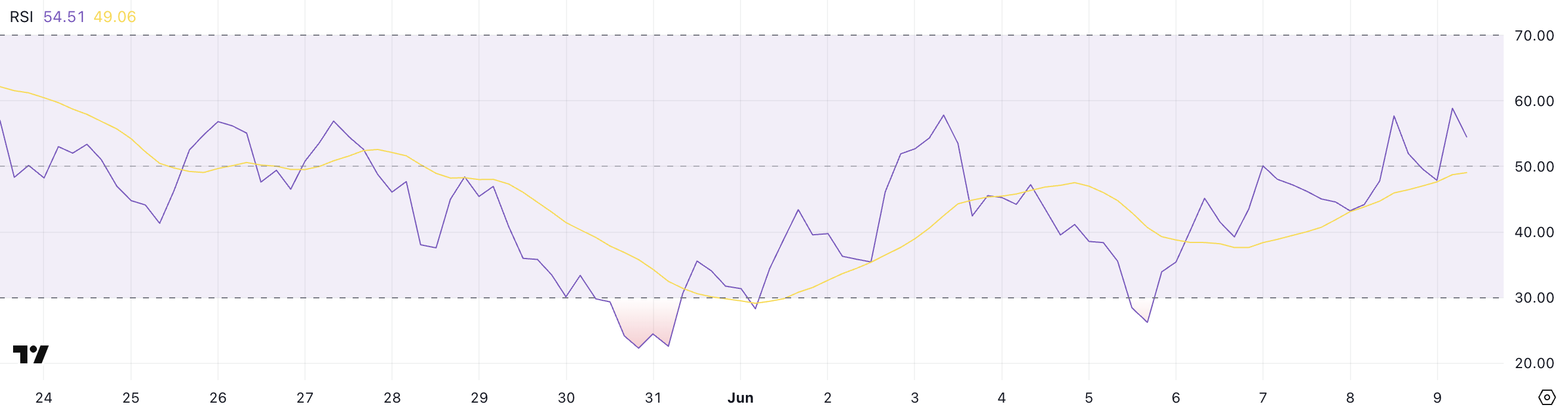 SOL मोमेंटम शिफ्ट के शुरुआती संकेत दिखा रहा है, जिसमें इसका Relative Strength Index (RSI) वर्तमान में 54.51 पर है—जो तीन दिन पहले 39.26 से काफी ऊपर है।