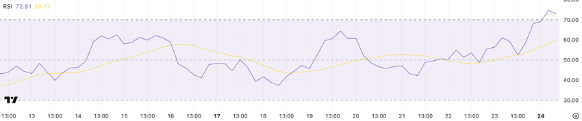 Solana का रिलेटिव स्ट्रेंथ इंडेक्स (RSI) 72.91 तक पहुंच गया है, जो एक दिन पहले 38.43 से तेजी से बढ़ा है—यह एक तेजी से मोमेंटम में बदलाव का संकेत देता है न्यूट्रल से मजबूत बुलिश टेरिटरी में।