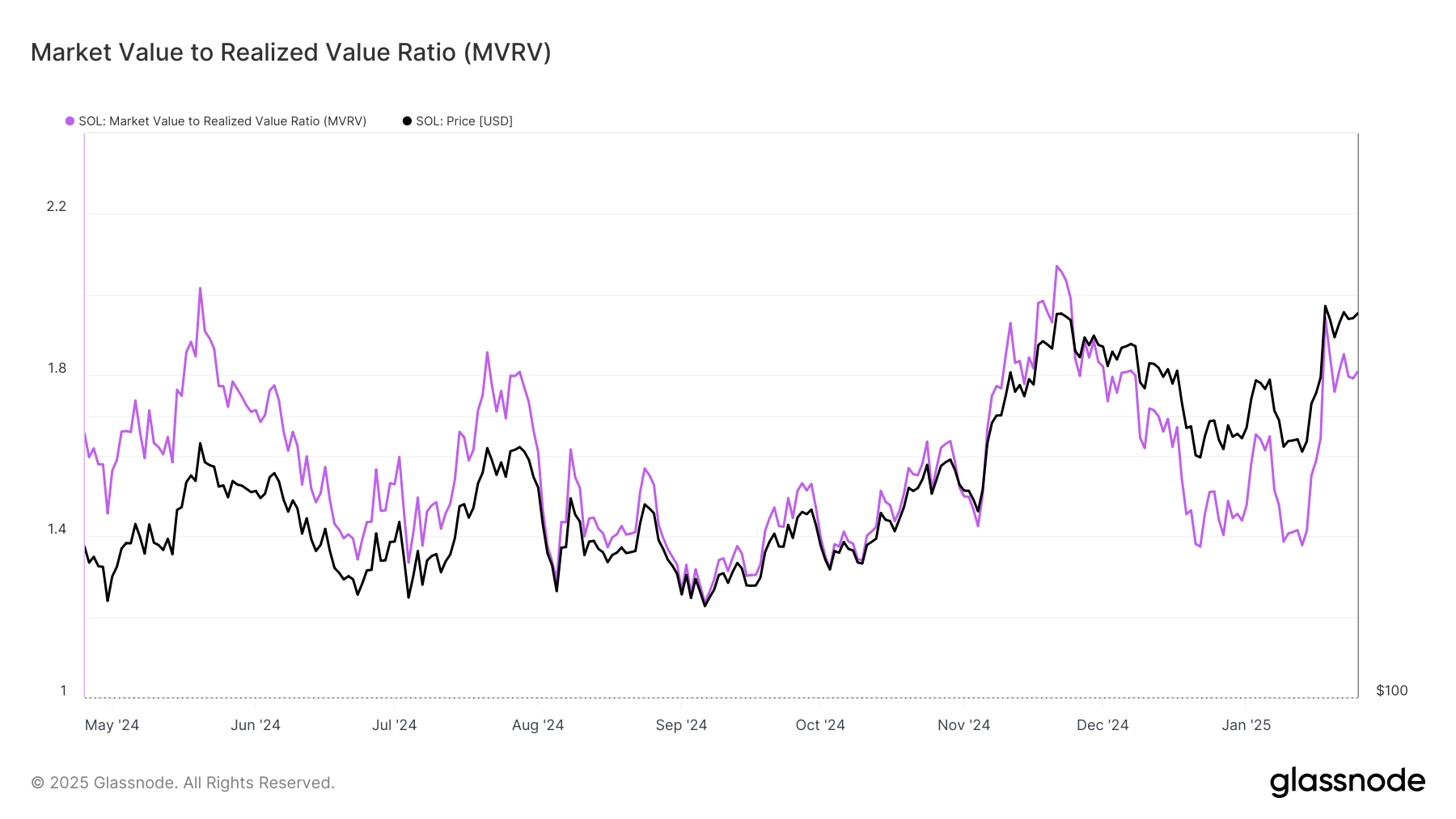 Solana का समग्र मोमेंटम इसके मार्केट वैल्यू टू रियलाइज्ड वैल्यू (MVRV) रेशियो में परिलक्षित होता है, जो वर्तमान में लगभग 1.80 के आसपास है। ऐतिहासिक रूप से, इस सीमा को पार करने से altcoin के लिए करेक्शन हुए हैं। हालांकि, इस निशान को पार करने के बावजूद, SOL ने महत्वपूर्ण रिट्रेसमेंट्स से बचा है, और इसकी अपट्रेंड केवल रुकी है।