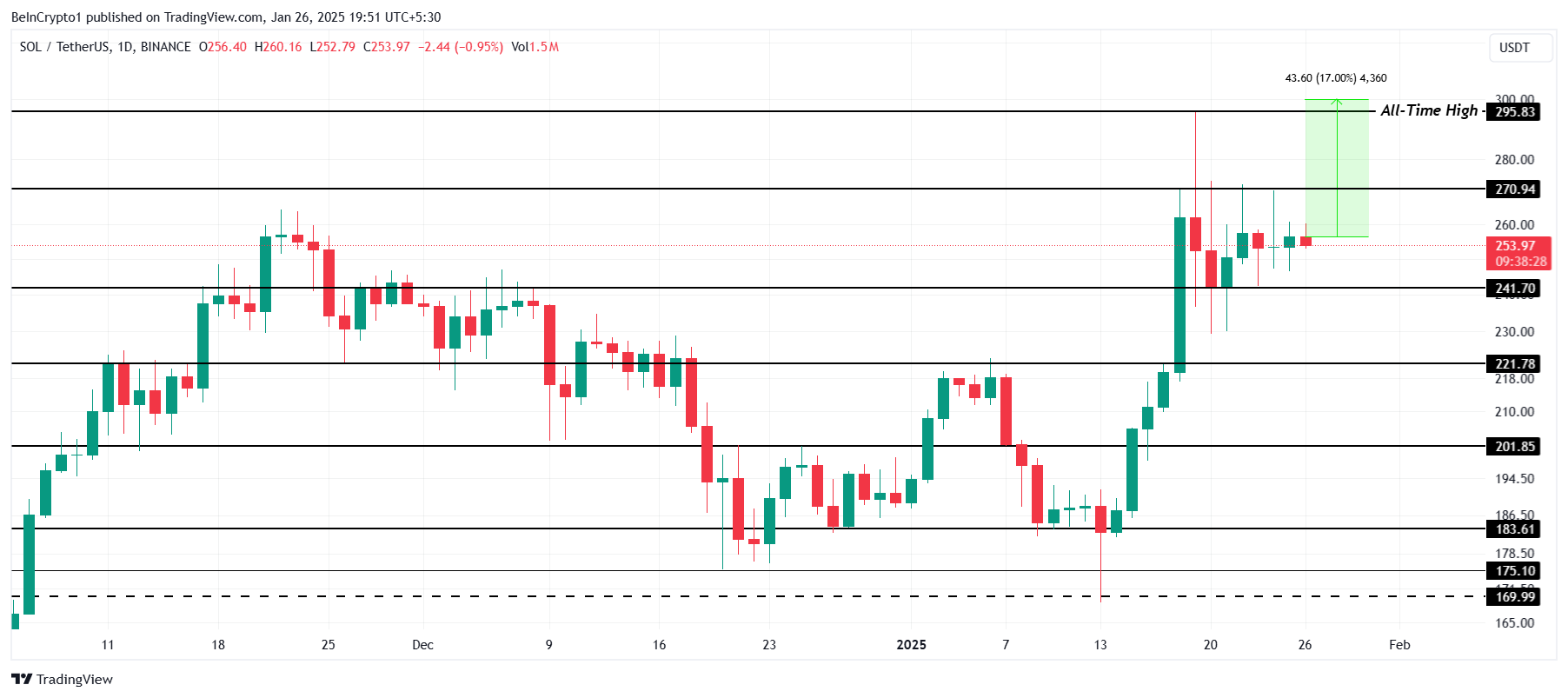 लेखन के समय, Solana $253 पर ट्रेड कर रहा है, $241 पर एक मजबूत सपोर्ट स्तर बनाए रखते हुए। SOL के लिए मुख्य बाधा $270 रेजिस्टेंस स्तर को एक सपोर्ट फ्लोर में बदलना है, जो अब तक altcoin के लिए मुश्किल साबित हुआ है।