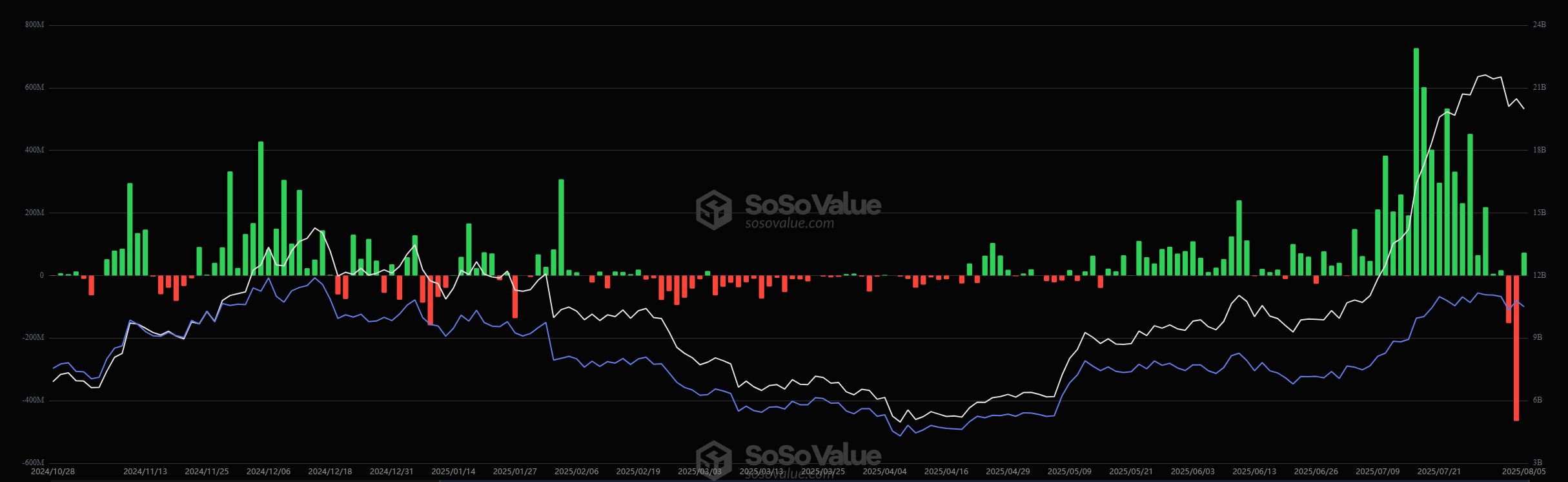 1 अगस्त को, ETFs ने $152 मिलियन के नेट आउटफ्लो रिकॉर्ड किए, इसके बाद 4 अगस्त को $465 मिलियन आउटफ्लो—एक दिन में सबसे बड़ा। BlackRock के ETHA ने इसमें से $375 मिलियन का योगदान दिया।