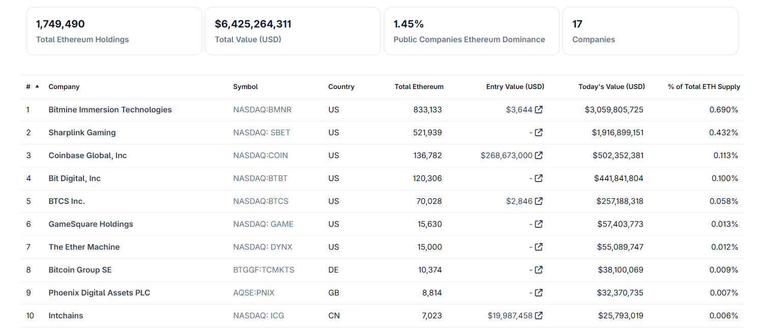 पिछले महीने में ही, इन फर्मों ने 545,000 ETH जोड़ा—जिसकी कीमत लगभग $1.6 बिलियन है। SharpLink Gaming ने उस अवधि के दौरान 50,000 ETH खरीदा, जिससे उसका कुल ETH 255,000 से अधिक हो गया।
