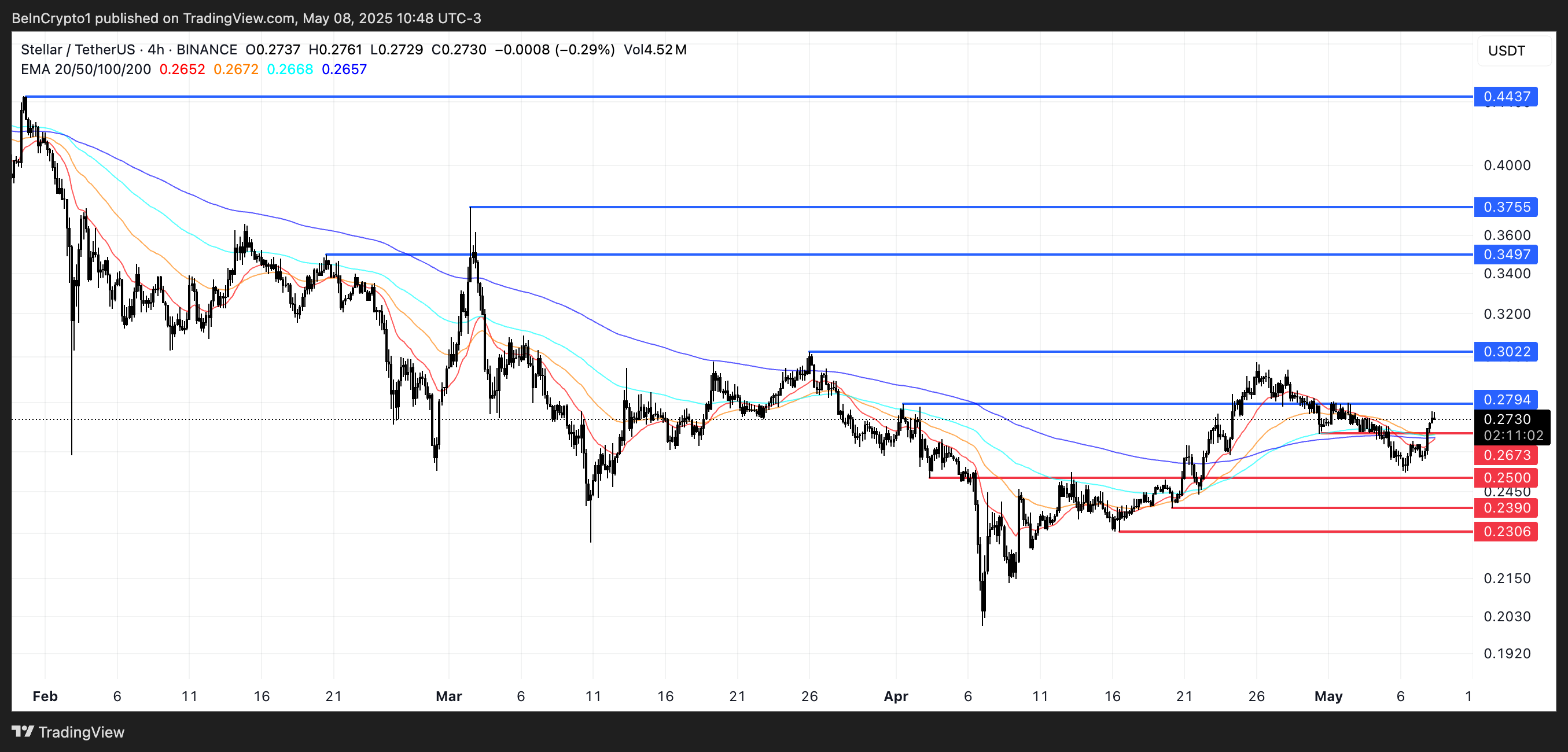Stellar की कीमत वर्तमान में $0.279 के रेजिस्टेंस और $0.267 के सपोर्ट के बीच एक संकीर्ण रेंज में ट्रेड कर रही है।