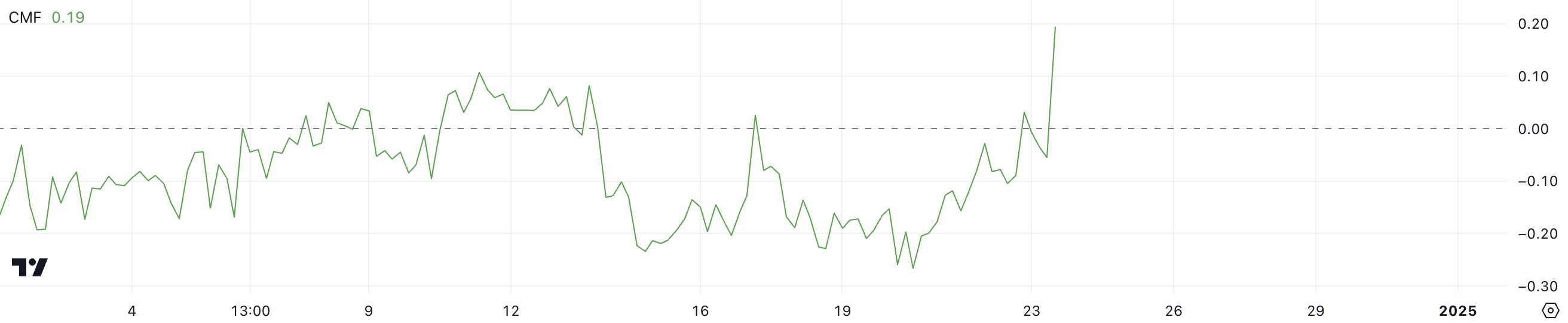 0.19 तक CMF स्पाइक, जो 24 नवंबर के बाद से सबसे ऊँचा रीडिंग है, मजबूत खरीद दबाव और संस्थागत संचय को संकेत करता है।