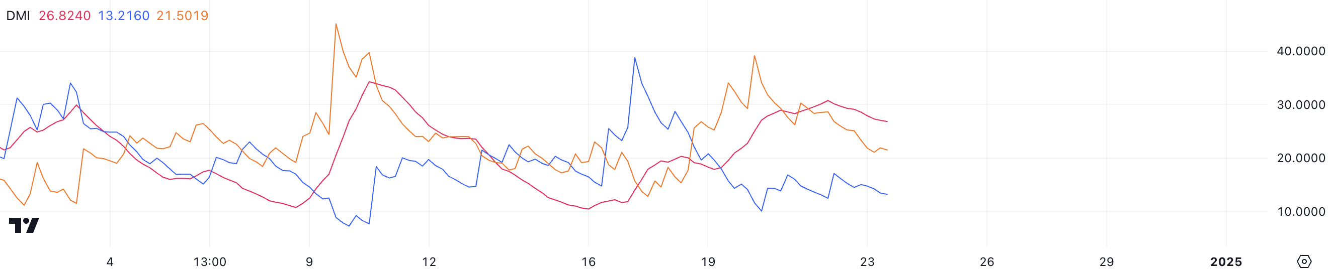 ADX दिशा की परवाह किए बिना ट्रेंड की ताकत को मापता है, 20 से नीचे की रीडिंग कमजोर ट्रेंड का संकेत देती है, 20-25 एक विकसित हो रहे ट्रेंड का सुझाव देती है, और 25 से ऊपर के मान एक मजबूत ट्रेंड का संकेत देते हैं। जब ADX 25 से ऊपर बढ़ता है, तो यह सुझाव देता है कि वर्तमान ट्रेंड गति प्राप्त कर रहा है और जारी रहने की संभावना है।