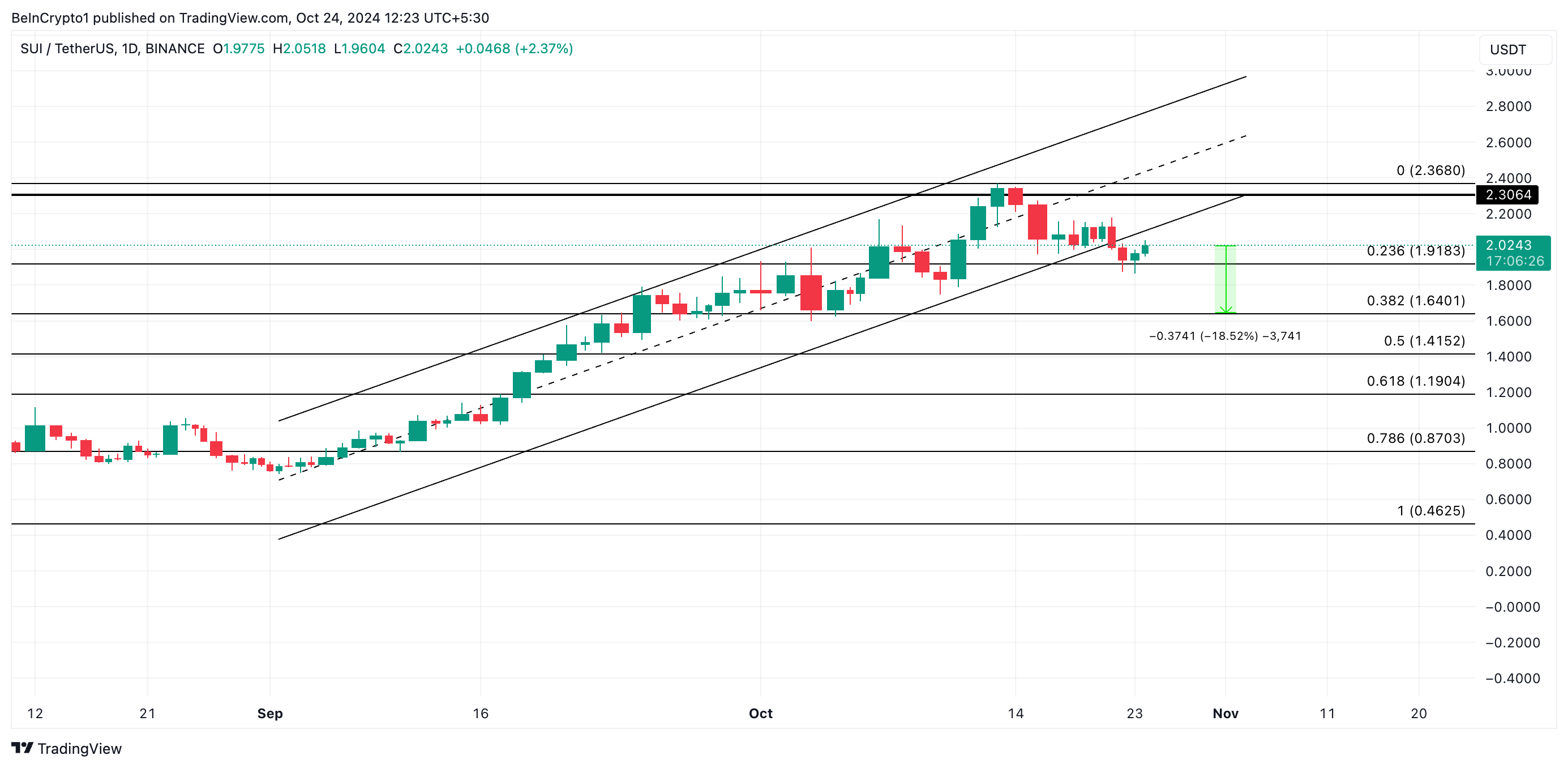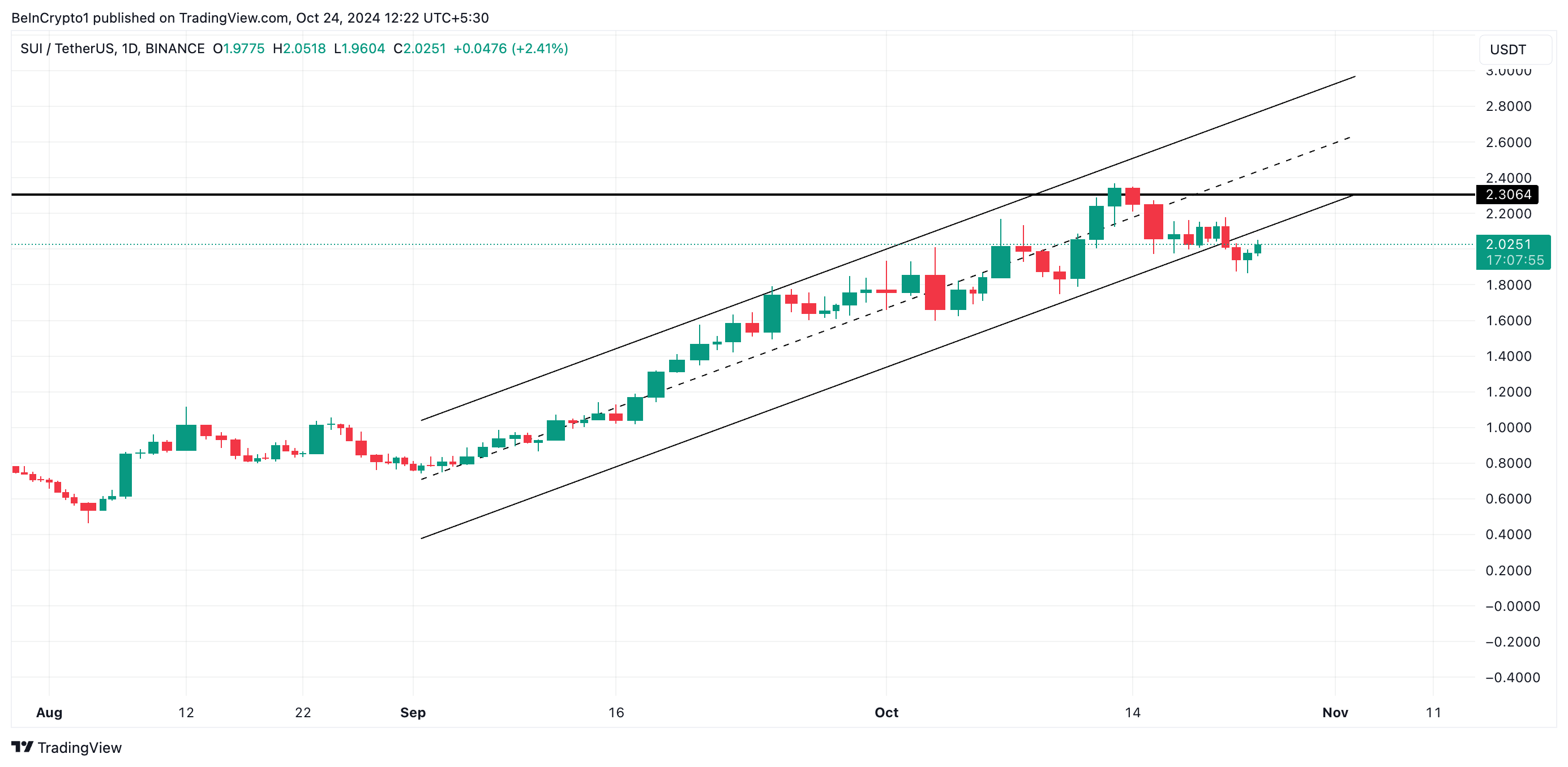 SUI/USD 1-दिन के चार्ट पर नजर डालने पर पता चलता है कि टोकन ने उस बढ़ते समानांतर चैनल की निचली रेखा के नीचे तोड़ दिया है जिसमें यह एक महीने से अधिक समय तक व्यापार कर रहा था। यह चैनल तब बनता है जब किसी संपत्ति की कीमत दो समानांतर प्रवृत्ति रेखाओं के बीच ऊपर की ओर बढ़ती है। यह एक तेजी का रुझान दर्शाता है, जहां कीमत ऊपरी और निचली प्रवृत्ति रेखाओं की सीमाओं के भीतर घूमती है।