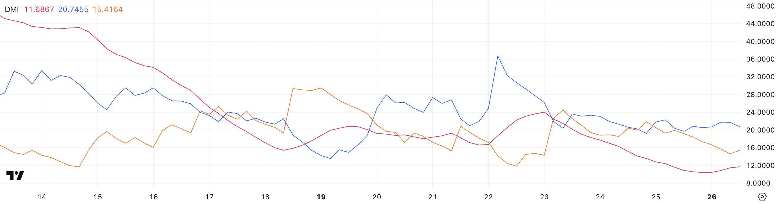 Tron का डायरेक्शनल मूवमेंट इंडेक्स (DMI) वर्तमान में एक कमजोर प्रवृत्ति दिखा रहा है, जिसमें एवरेज डायरेक्शनल इंडेक्स (ADX) तीन दिन पहले के 24 से घटकर 11.68 पर आ गया है।