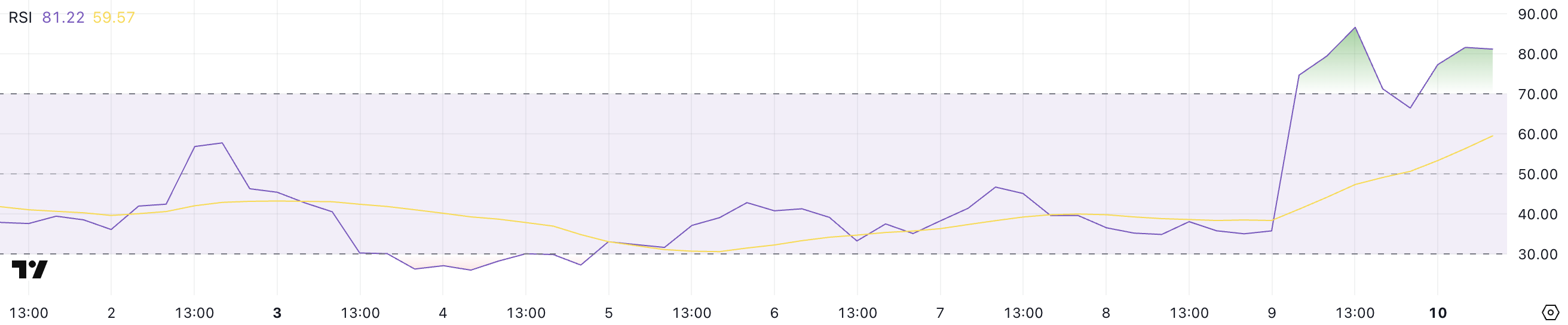 RARE का RSI अब 81.2 पर है, यह नवंबर 2024 के बाद पहली बार ओवरबॉट क्षेत्र में पहुंचा है, जो सात महीनों में इसका उच्चतम स्तर है।