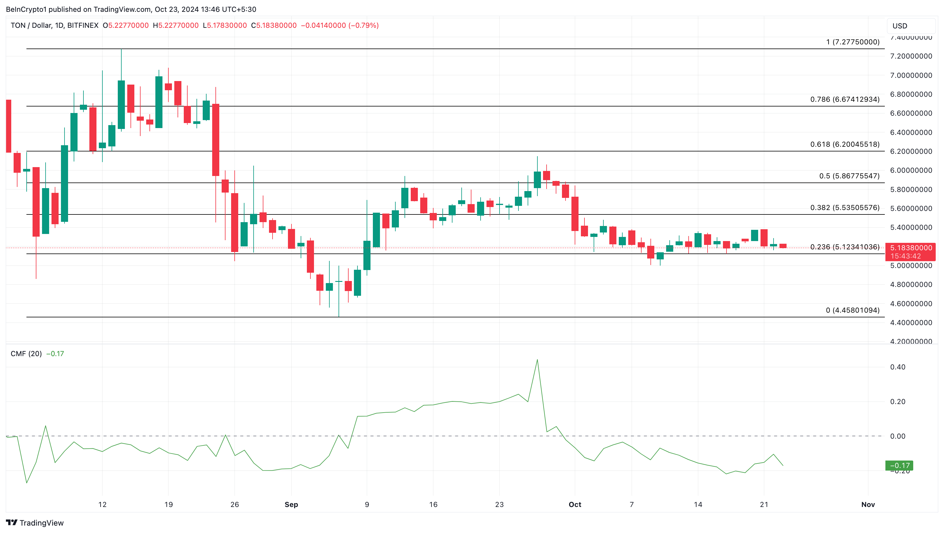 वर्तमान में, Toncoin की कीमत $5.18 है, और दैनिक चार्ट दिखाता है कि Chaikin Money Flow (CMF) 28 सितंबर से नकारात्मक क्षेत्र में है।