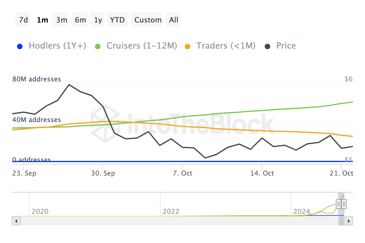 यह भावना संभवतः Toncoin के साथ जुड़ाव में गिरावट का कारण बनी। इसके अलावा, IntoTheBlock से प्राप्त डेटा ने अल्पकालिक धारकों की संख्या में गिरावट को दर्शाया। अगस्त और सितंबर के एयरड्रॉप्स के नेतृत्व में, TON ने अल्पकालिक धारकों की संख्या में भारी वृद्धि देखी।