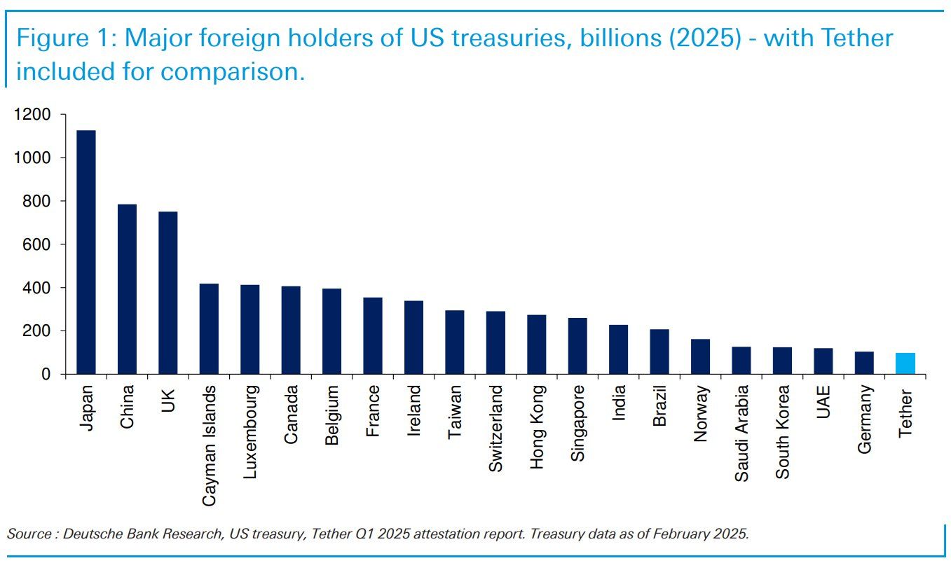 वर्तमान में, Tether दुनिया के सबसे बड़े US Treasuries धारकों में से एक है। $120 बिलियन से अधिक के US Treasuries के साथ, Tether की होल्डिंग्स कुछ देशों जैसे जर्मनी के आकार के करीब पहुंच रही है।